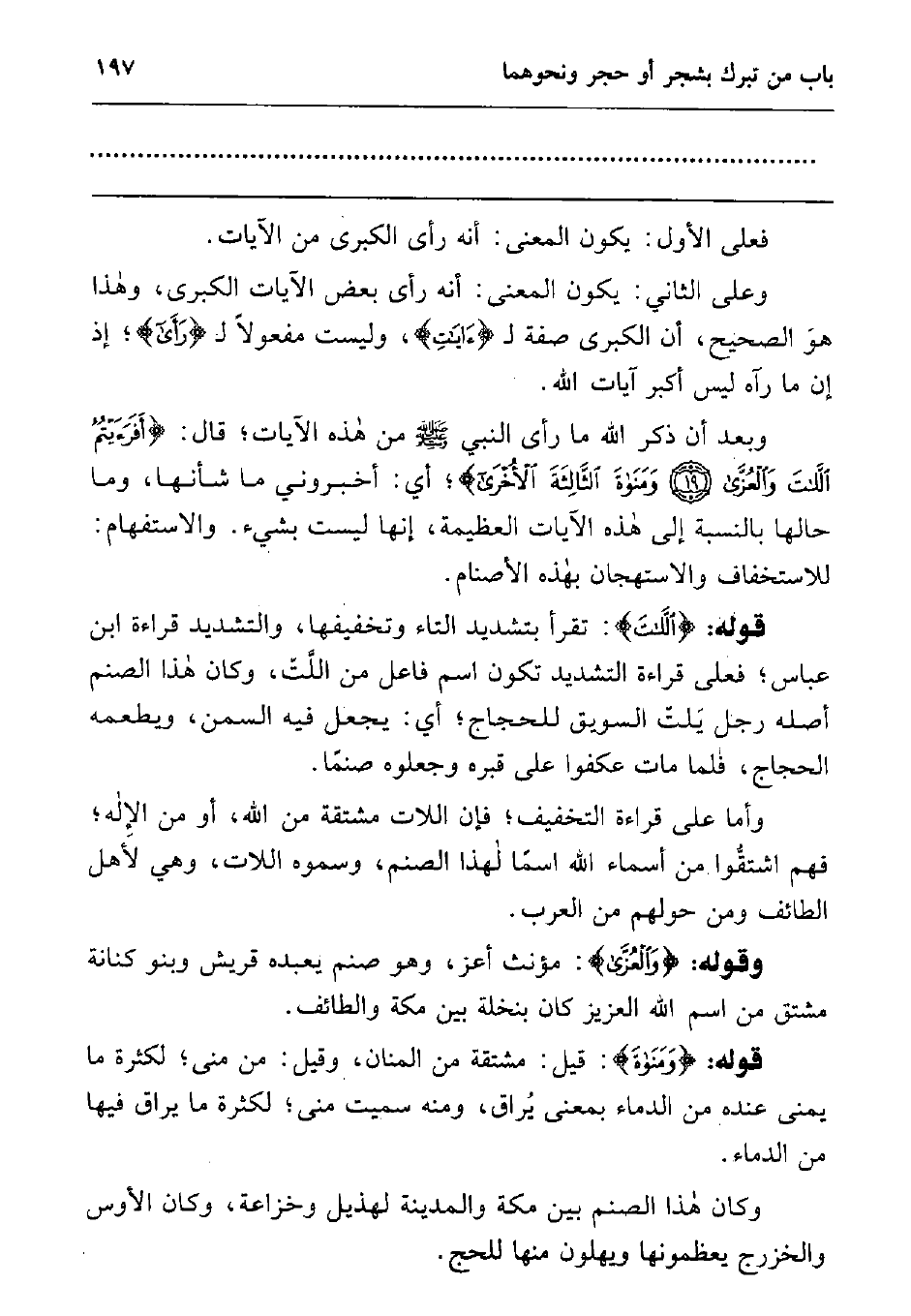 قوله: " اللات ": تقرأ بتشديد التاء وتخفيفها، والتشديد قراءة ابن عباس; فعلى قراءة التشديد تكون اسم فاعل من اللّتِّ، وكان هذا الصنم أصله رجل يلت السويق للحجاج; أي: يجعل فيه السمن، ويطعمه الحجاج، فلما مات عكفوا على قبره وجعلوه صنما.