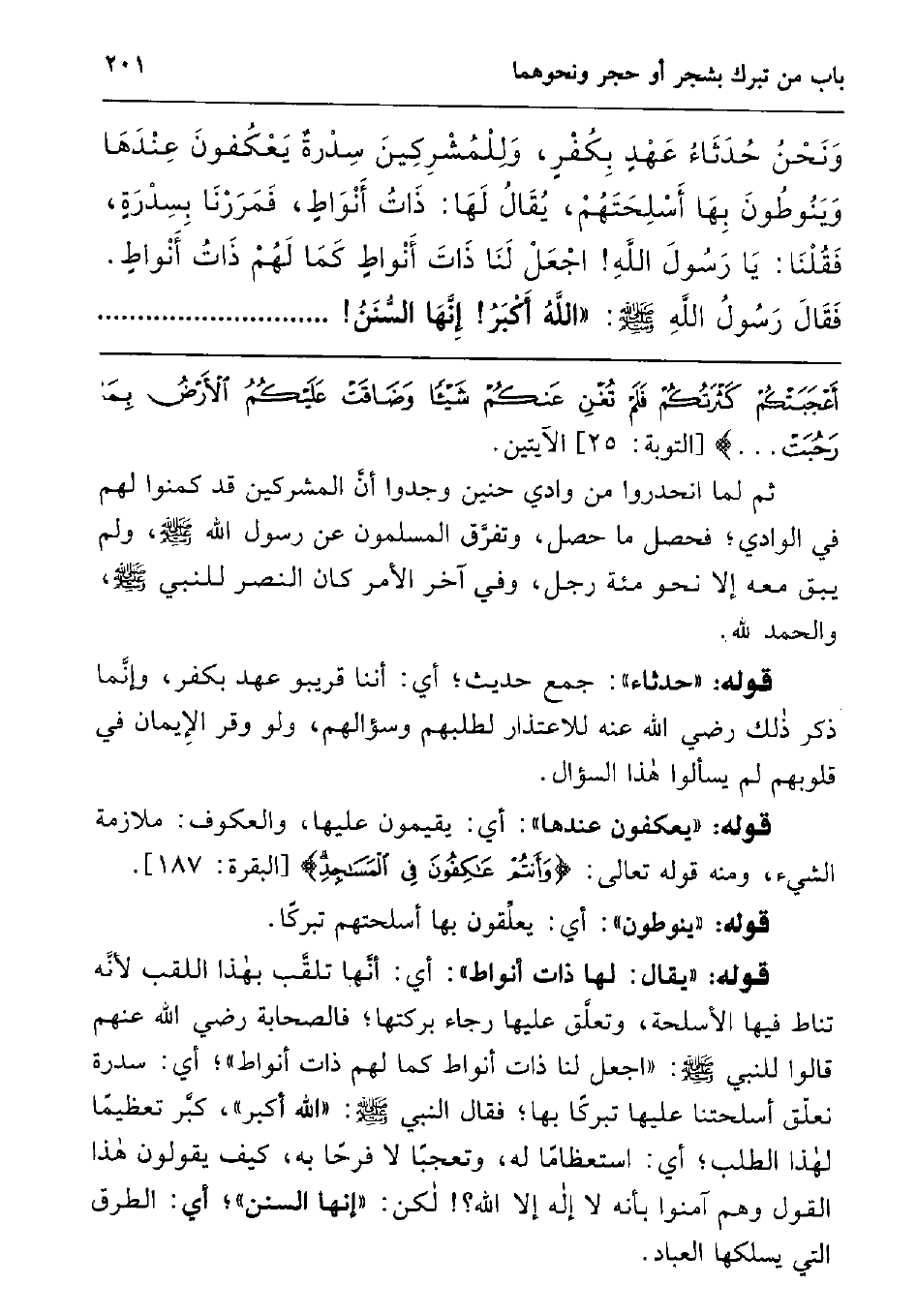 ونحن حدثاء عهد بكفر، وللمشركين سدرة يعكفون عندها وينوطون بها أسلحتهم، يقال لها: ذات أنواط، فمررنا بسدرة، فقلنا: يا رسول الله! اجعل لنا ذات أنواط كما لهم ذات أنواط. فقال رسول الله صلى الله عليه وسلم الله أكبر! إنها السنن!................................................................