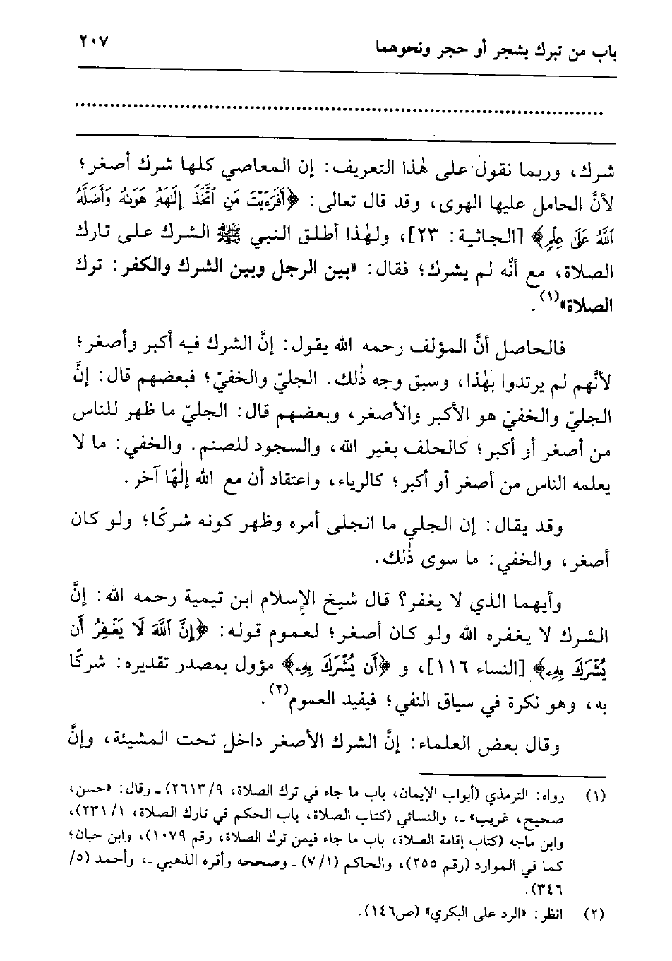شرك، وربما نقول على هذا التعريف: إن المعاصي كلها شرك أصغر، لأن الحامل عليها الهوى، وقد قال تعالى: {أَفَرَأَيْتَ مَنِ اتَّخَذَ إِلَهَهُ هَوَاهُ وَأَضَلَّهُ اللَّهُ عَلَى عِلْمٍ} 1 ولهذا أطلق النبي صلى الله عليه وسلم الشرك على تارك الصلاة، مع أنه لم يشرك، فقال: " بين الرجل وبين الشرك والكفر: ترك الصلاة " 2. فالحاصل أن المؤلف رحمه الله يقول: إن الشرك فيه أكبر وأصغر، لأنهم لم يرتدوا بهذا، وسبق وجه ذلك. الجلي والخفي، فبعضهم قال: إن الجلي والخفي هو الأكبر والأصغر. وبعضهم قال: الجلي ما ظهر للناس من أصغر أو أكبر، كالحلف بغير الله، والسجود للصنم. والخفي: ما لا يعلمه الناس من أصغر أو أكبر، كالرياء، واعتقاد أن مع الله إلها آخر. وقد يقال: إن الجلي ما انجلى أمره وظهر كونه شركا، ولو كان أصغر، والخفي: ما سوى ذلك. وأيهما الذي لا يغفر، قال شيخ الإسلام ابن تيمية رحمه الله: إن الشرك لا يغفره الله ولو كان أصغر، لعموم قوله: {إِنَّ اللَّهَ لا يَغْفِرُ أَنْ يُشْرَكَ بِهِ} 3 و" أن يشرك به " مؤول بمصدر تقديره: شركا به، وهو نكرة في سياق النفي، فيفيد العموم4. وقال بعض العلماء: إن الشرك الأصغر داخل تحت المشيئة، وإن