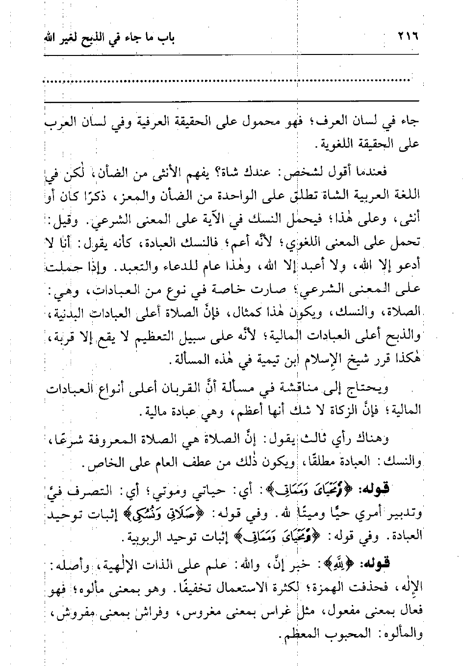 فعندما أقول لشخص: عندك شاة؟ يفهم الأنثى من الضأن، لكن في اللغة العربية الشاة تطلق على الواحدة من الضأن والمعز، ذكرا كان أو أنثى، وعلى هذا، فيحمل النسك في الآية على المعنى الشرعي. وقيل: تحمل على المعنى اللغوي، لأنه أعم، فالنسك العبادة، كأنه يقول: أنا لا أدعو إلا الله، ولا أعبد إلا الله، وهذا عام للدعاء والتعبد.