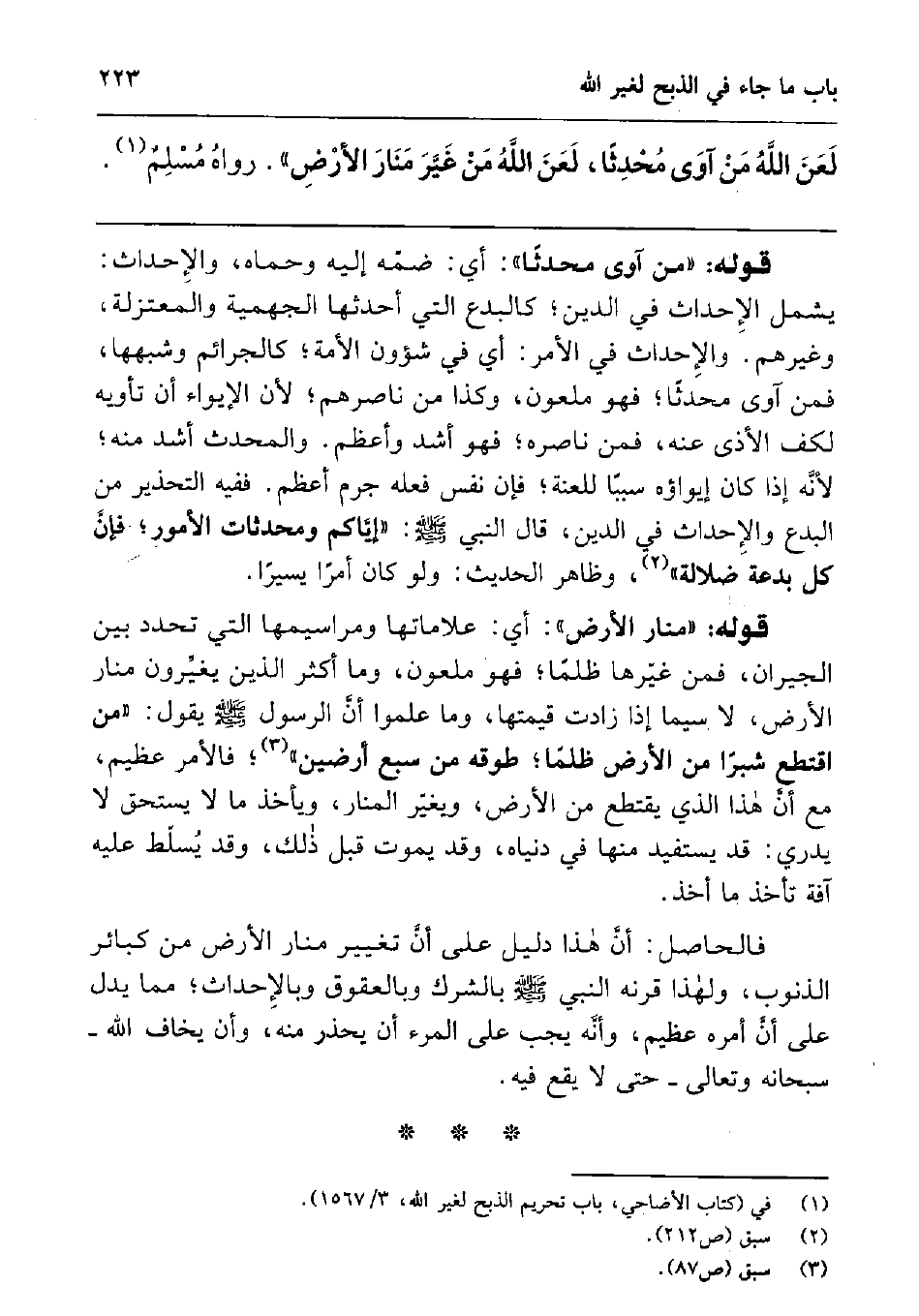 فالحاصل: أن هذا دليل على أن تغيير منار الأرض من كبائر الذنوب، ولهذا قرنه النبي صلى الله عليه وسلم بالشرك وبالعقوق وبالإحداث، مما يدل على أن أمره عظيم، وأنه يجب على المرء أن يحذر منه، وأن يخاف الله- سبحانه وتعالى- حتى لا يقع فيه.