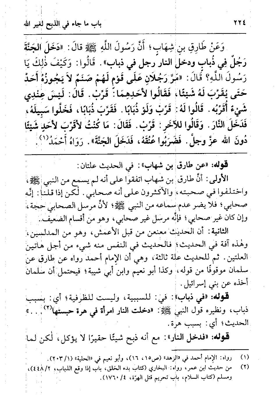 وعن طارق بن شهاب; أن رسول الله صلى الله عليه وسلم قال: " دخل الجنة رجل في ذباب ودخل النار رجل في ذباب. قالوا: وكيف ذلك يا رسول الله؟ قال: مر رجلان على قوم لهم صنم، لا يجوزه أحد حتى يقرب له شيئا، فقالوا لأحدهما: قرب قال: ليس عندي شيء أقربه. قالوا له: قرب ولو ذبابا. فقرب ذبابا، فخلوا سبيله، فدخل النار. وقالوا للآخر: قرب. فقال: ما كنت لأقرب لأحد شيئا دون الله عزوجل فضربوا عنقه، فدخل الجنة " رواه أحمد1.