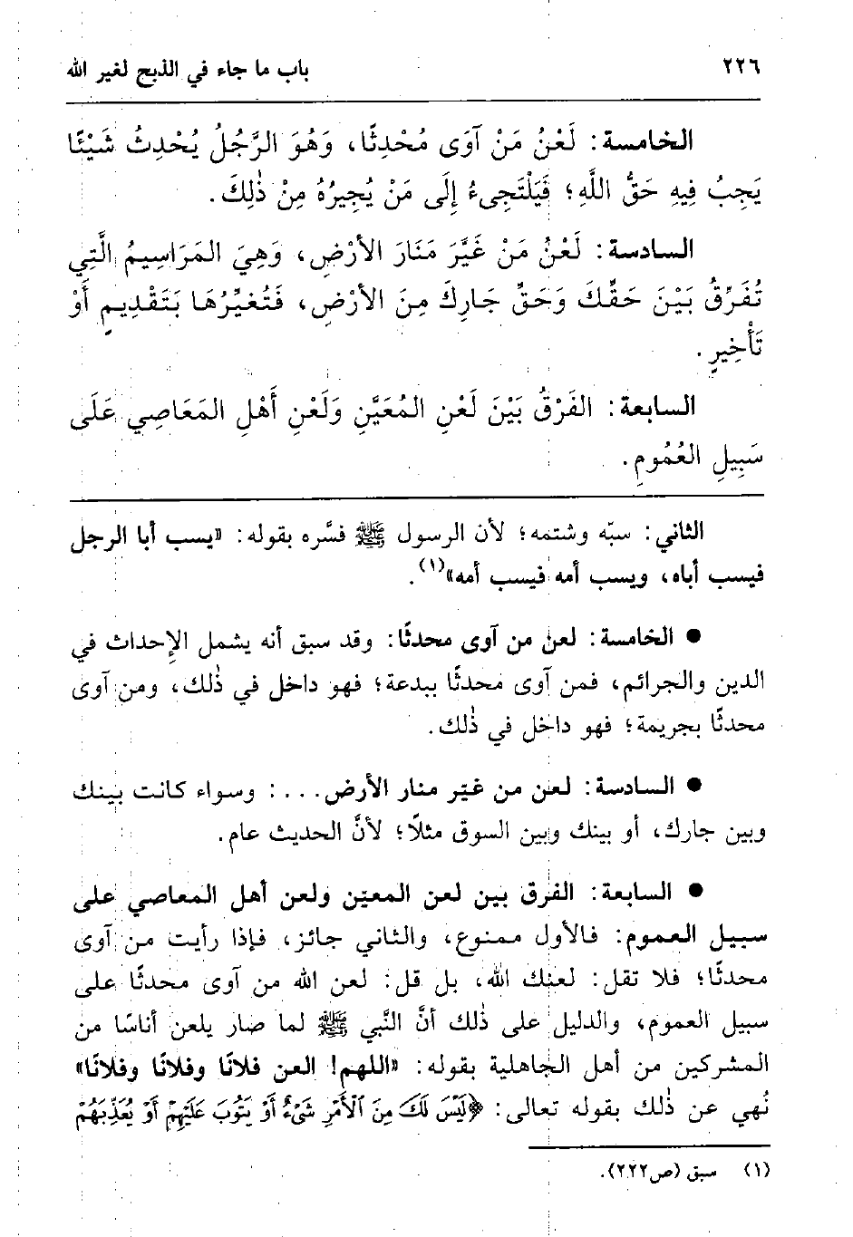 السابعة: الفرق بين لعن المعين ولعن أهل المعاصي على سبيل العموم: فالأول ممنوع، والثاني جائز، فإذا رأيت من آوى محدثا، فلا تقل: لعنك الله، بل قل: لعن الله من آوى محدثا على سبيل العموم، والدليل على ذلك أن النبي صلى الله عليه وسلم لما صار يلعن أناسا من المشركين من أهل الجاهلية بقوله: "اللهم! العن فلانا وفلانا وفلانا " نهي عن ذلك بقوله تعالى: {لَيْسَ لَكَ مِنَ الْأَمْرِ شَيْءٌ أَوْ يَتُوبَ عَلَيْهِمْ أَوْ يُعَذِّبَهُمْ