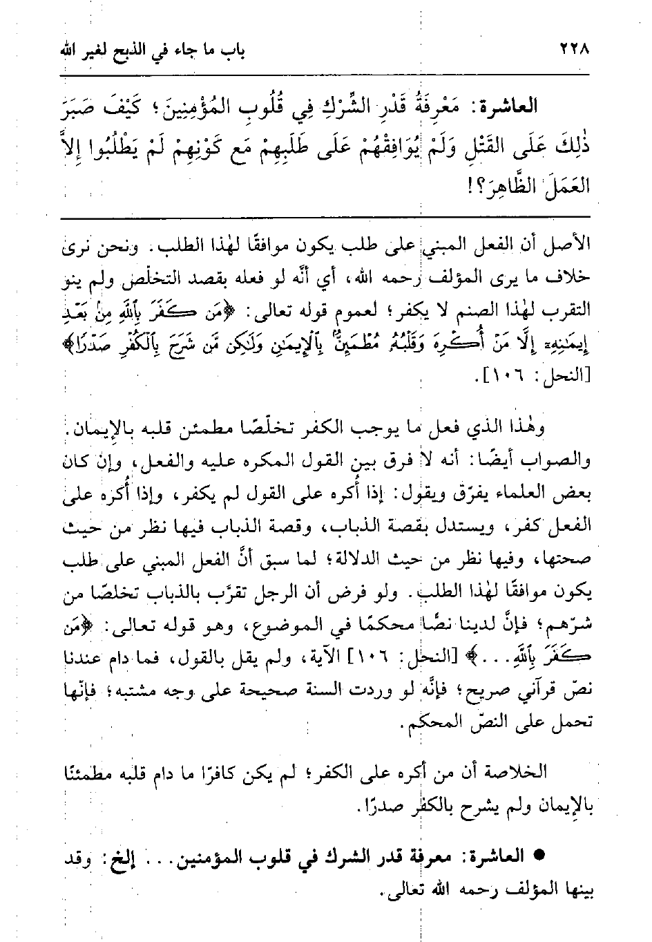 الأصل أن الفعل المبني على طلب يكون موافقا لهذا الطلب. ونحن نرى خلاف ما يرى المؤلف رحمه الله، أي أنه لو فعله بقصد التخلص ولم ينو التقرب لهذا الصنم لا يكفر، لعموم قوله تعالى: {مَنْ كَفَرَ بِاللَّهِ مِنْ بَعْدِ إِيمَانِهِ إِلاَّ مَنْ أُكْرِهَ وَقَلْبُهُ مُطْمَئِنٌّ بِالأِيمَانِ وَلَكِنْ مَنْ شَرَحَ بِالْكُفْرِ صَدْراً} 1 وهذا الذي فعل ما يوجب الكفر تخلصا مطمئن قلبه بالإيمان. والصواب أيضا: أنه لا فرق بين القول المكره عليه والفعل، وإن كان بعض العلماء يفرق ويقول: إذا أكره على القول لم يكفر، وإذا أكره على الفعل كفر، ويستدل بقصة الذباب، وقصة الذباب فيها نظر من حيث صحتها، وفيها نظر من حيث الدلالة; لما سبق أن الفعل المبني على طلب يكون موافقا لهذا الطلب. ولو فرض أن الرجل تقرب بالذباب تخلصا من شرهم، فإن لدينا نصا محكما في الموضوع، وهو قوله تعالى: {مَنْ كَفَرَ بِاللَّهِ} 2 الآية، ولم يقل بالقول، فما دام عندنا نص قرآني صريح، فإنه لو وردت السنة صحيحة على وجه مشتبه، فإنها تحمل على النص المحكم. الخلاصة أن من أكره على الكفر، لم يكن كافرا ما دام قلبه مطمئنا بالإيمان ولم يشرح بالكفر صدرا.