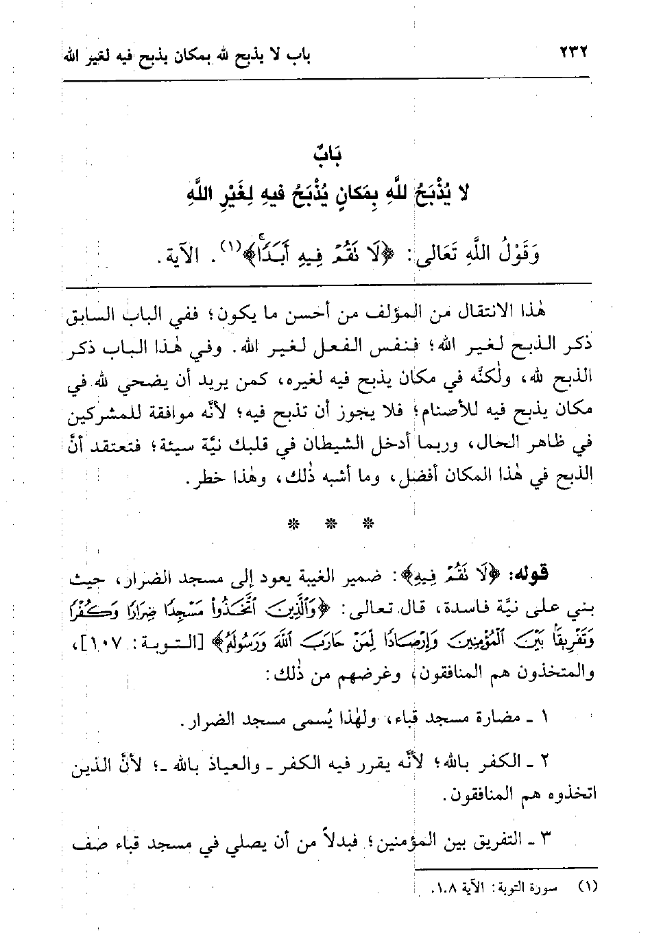 هذا الانتقال من المؤلف من أحسن ما يكون، ففي الباب السابق ذكر الذبح لغير الله، فنفس الفعل لغير الله. وفي هذا الباب ذكر الذبح لله، ولكنه في مكان يذبح فيه لغيره، كمن يريد أن يضحي لله في مكان يذبح فيه للأصنام، فلا يجوز أن تذبح فيه، لأنه موافقة للمشركين في ظاهر الحال، وربما أدخل الشيطان في قلبك نية سيئة، فتعتقد أن الذبح في هذا المكان أفضل، وما أشبه ذلك، وهذا خطر.