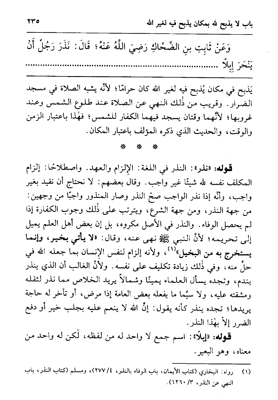 وعن ثابت بن الضحاكرضي الله عنهقال: " نذر رجل أن ينحر إبلا..........................