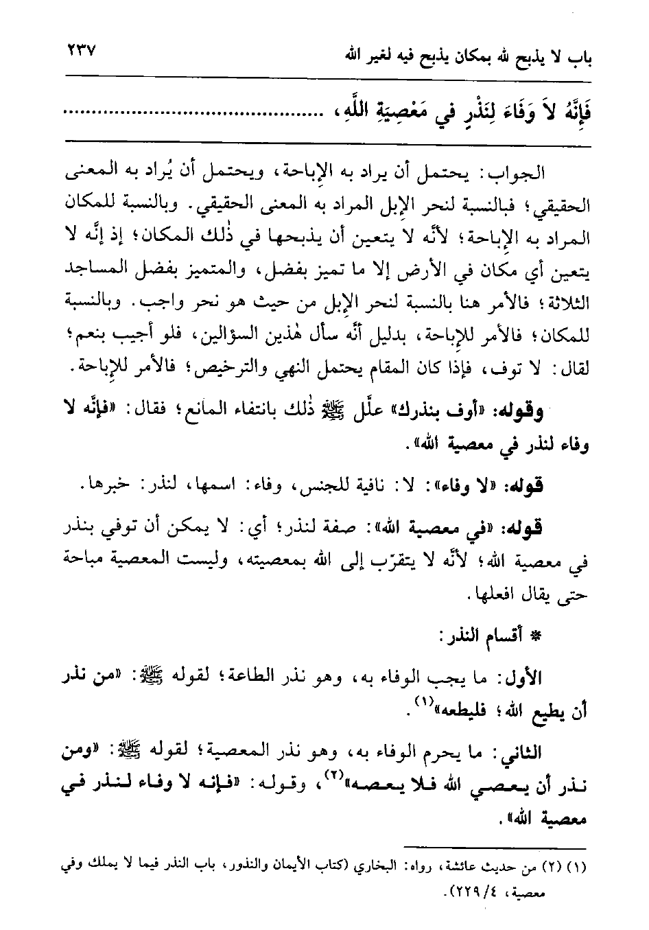 قوله: "لا وفاء": لا: نافية للجنس، وفاء: اسمها، لنذر: خبرها. قوله: "في معصية الله": صفة لنذر، أي: لا يمكن أن توفي بنذر في معصية الله، لأنه لا يتقرب إلى الله بمعصيته، وليست المعصية مباحة، حتى يقال: افعلها.