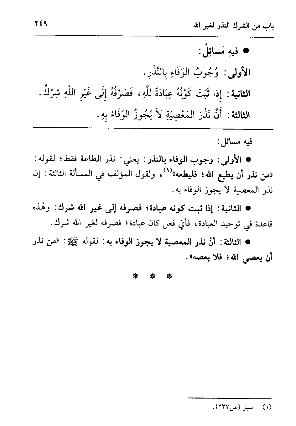 الأولى: وجوب الوفاء بالنذر: يعني: نذر الطاعة فقط، لقوله: " من نذر أن يطيع الله، فليطعه" 1 ولقول المؤلف في المسألة الثالثة: إن نذر المعصية لا يجوز الوفاء به.