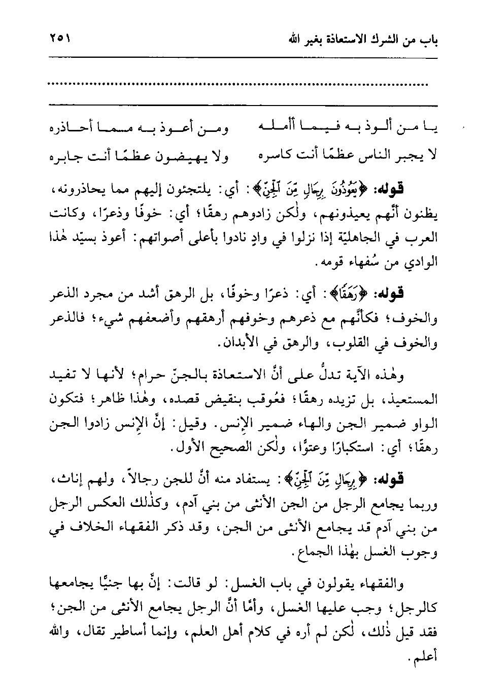 قوله: {يَعُوذُونَ بِرِجَالٍ مِنَ الْجِنِّ} 1 أي: يلتجئون إليهم مما يحاذرونه، يظنون أنهم يعيذونهم، ولكن زادوهم رهقا، أي: خوفا وذعرا، وكانت العرب في الجاهلية إذا نزلوا في واد نادوا بأعلى أصواتهم: أعوذ بسيد هذا الوادي من سفهاء قومه.