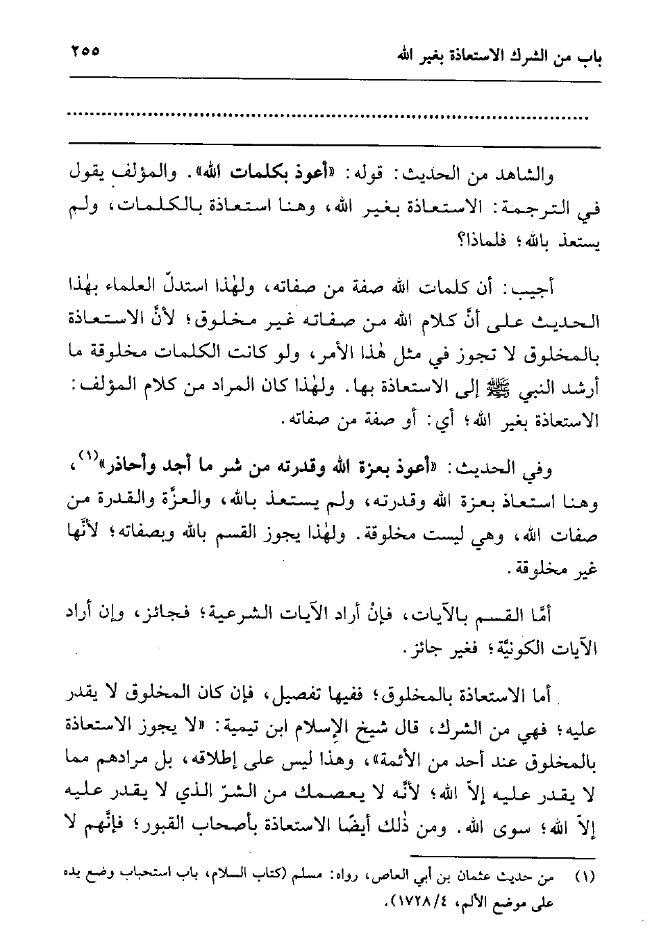 والشاهد من الحديث: قوله: أعود بكلمات الله. والمؤلف يقول في الترجمة: الاستعاذة بغير الله، وهنا استعاذة بالكلمات، ولم يستعذ بالله، فلماذا؟ أجيب: أن كلمات الله صفة من صفاته، ولهذا استدل العلماء بهذا الحديث على أن كلام الله من صفاته غير مخلوق، لأن الاستعاذة بالمخلوق لا تجوز في مثل هذا الأمر، ولو كانت الكلمات مخلوقة ما أرشد النبي صلى الله عليه وسلم إلى الاستعاذة بها. ولهذا كان المراد من كلام المؤلف: الاستعاذة بغير الله، أي: أو صفة من صفاته.