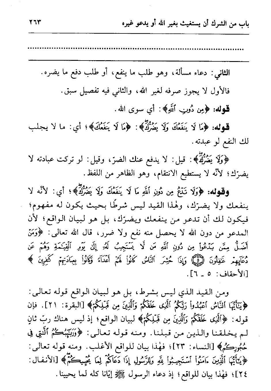 قوله: {مِنْ دُونِ اللَّهِ} أي سوى الله. قوله: {مَا لا يَنْفَعُكَ وَلا يَضُرُّكَ} 1 " ما لا ينفعك " أي: ما لا يجلب لك النفع لو عبدته. " ولا يضرك ": قيل: لا يدفع عنك الضر، وقيل: لو تركت عبادته لا يضرك، لأنه لا يستطيع الانتقام، وهو الظاهر من اللفظ. وقوله: {وَلا تَدْعُ مِنْ دُونِ اللَّهِ مَا لا يَنْفَعُكَ وَلا يَضُرُّكَ} 2 أي: لأنه لا ينفعك ولا يضرك، وهذا القيد ليس شرطا بحيث يكون له مفهوم، فيكون لك أن تدعو من ينفعك ويضرك، بل هو لبيان الواقع، لأن المدعو من دون الله لا يحصل منه نفع ولا ضرر، قال الله تعالى: {وَمَنْ أَضَلُّ مِمَّنْ يَدْعُو مِنْ دُونِ اللَّهِ مَنْ لا يَسْتَجِيبُ لَهُ إِلَى يَوْمِ الْقِيَامَةِ وَهُمْ عَنْ دُعَائِهِمْ غَافِلُونَ وَإِذَا حُشِرَ النَّاسُ كَانُوا لَهُمْ أَعْدَاءً وَكَانُوا بِعِبَادَتِهِمْ كَافِرِينَ} 3 ومن القيد الذي ليس بشرط، بل هو لبيان الواقع قوله تعالى: {يَا أَيُّهَا النَّاسُ اعْبُدُوا رَبَّكُمُ الَّذِي خَلَقَكُمْ وَالَّذِينَ مِنْ قَبْلِكُمْ} 4 فإن قوله: {الَّذِي خَلَقَكُمْ وَالَّذِينَ مِنْ قَبْلِكُمْ} 5 لبيان الواقع، إذ ليس هناك رب ثان لم يخلقنا والذين من قبلنا. ومنه قوله تعالى: {وَرَبَائِبُكُمُ اللاتِي فِي حُجُورِكُمْ} 6 فهذا بيان للواقع الأغلب. ومنه قوله تعالى: {يَا أَيُّهَا الَّذِينَ آمَنُوا اسْتَجِيبُوا لِلَّهِ وَلِلرَّسُولِ إِذَا دَعَاكُمْ لِمَا يُحْيِيكُمْ} 7 فهذا بيان للواقع، إذ دعاء الرسول صلى الله عليه وسلم إيانا كله لما يحيينا.