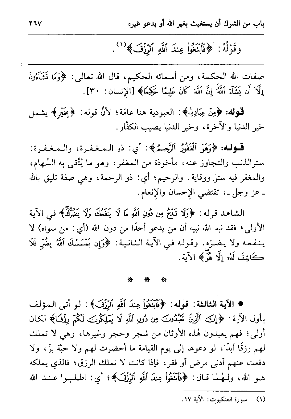 الآية الثالثة: قوله: {فَابْتَغُوا عِنْدَ اللَّهِ الرِّزْقَ} لو أتى المؤلف بأول الآية: {إِنَّ الَّذِينَ تَعْبُدُونَ مِنْ دُونِ اللَّهِ لا يَمْلِكُونَ لَكُمْ رِزْقاً} 5 لكان أولى، فهم يعبدون هذه الأوثان من شجر وحجر وغيرها، وهي لا تملك لهم رزقا أبدا، لو دعوها إلى يوم القيامة ما أحضرت لهم ولا حبة بر، ولا دفعت عنهم أدنى مرض أو فقر، فإذا كانت لا تملك الرزق، فالذي يملكه هو الله، ولهذا قال: {فَابْتَغُوا عِنْدَ اللَّهِ الرِّزْقَ} 6 أي: اطلبوا عند الله