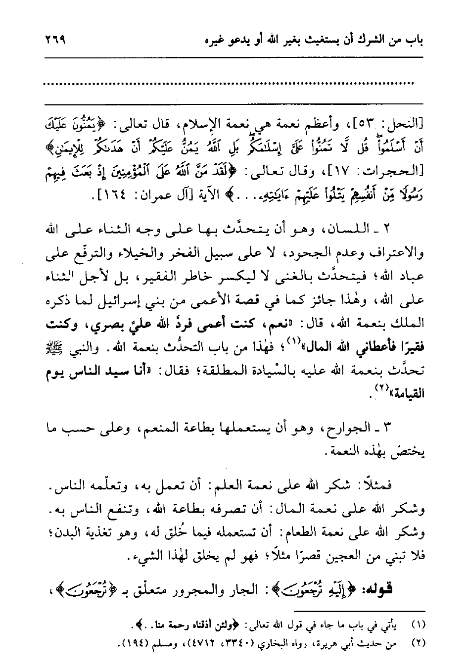 2. اللسان، وهو أن يتحدث بها على وجه الثناء على الله والاعتراف وعدم الجحود، لا على سبيل الفخر والخيلاء والترفع على عباد الله، فيتحدث بالغنى لا ليكسر خاطر الفقير، بل لأجل الثناء على الله، وهذا جائز كما في قصة الأعمى من بني إسرائيل لما ذكره الملك بنعمة الله، قال: " نعم، كنت أعمى فرد الله علي بصري، وكنت فقيرا فأعطاني الله المال "3 فهذا من باب التحدث بنعمة الله. والنبي صلى الله عليه وسلم تحدث بنعمة الله عليه بالزيادة المطلقة; فقال: " أنا سيد الناس يوم القيامة " 4.