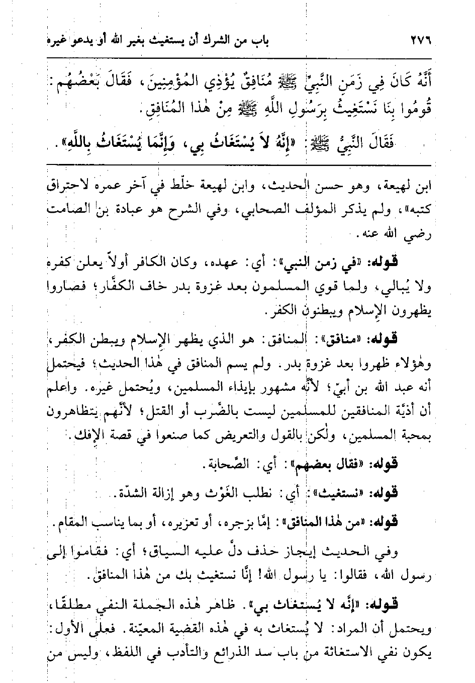 قوله: "من هذا المنافق": إما بزجره، أو تعزيره، أو بما يناسب المقام. وفي الحديث إيجاز حذف دل عليه السياق، أي: فقاموا إلى رسول الله، فقالوا: يا رسول الله! إنا نستغيث بك من هذا المنافق. قوله: (إنه لا يستغاث بي) ظاهر هذه الجملة النفي مطلقا، ويحتمل أن المراد: لا يستغاث به في هذه القضية المعينة. فعلى الأول: يكون نفي الاستغاثة من باب سد الذرائع والتأدب في اللفظ، وليس من