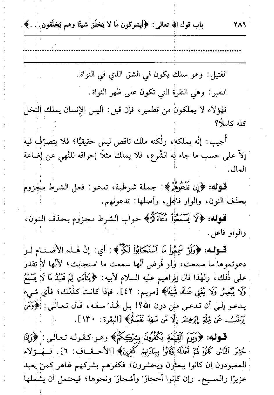 فهؤلاء لا يملكون من قطمير، فإن قيل: أليس الإنسان يملك النخل كله كاملا؟ أجيب: إنه يملكه، ولكنه ملك ناقص ليس حقيقيا; فلا يتصرف فيه إلا على حسب ما جاء به الشرع، فلا يملك مثلا إحراقه للنهي عن إضاعة المال. قوله: " إن تدعوهم ": جملة شرطية، تدعو: فعل الشرط مجزوم بحذف النون، والواو فاعل، وأصلها: تدعونهم. قوله: {لا يَسْمَعُوا دُعَاءَكُمْ} 1 جواب الشرط مجزوم بحذف النون، والواو فاعل.