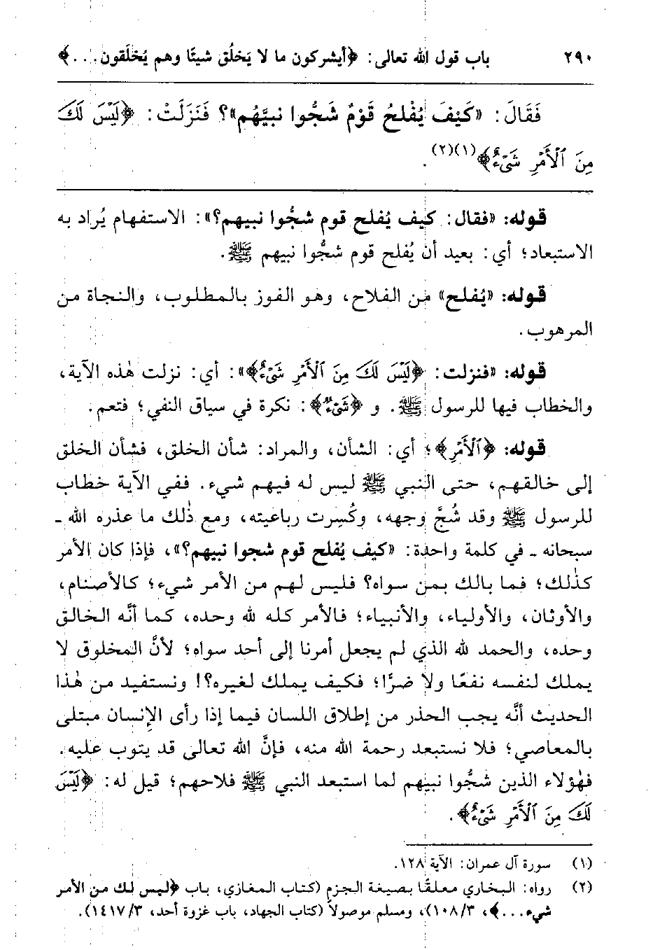قوله: (الأمر) أي: الشأن، والمراد: شأن الخلق، فشأن الخلق إلى خالقهم، حتى النبي صلى الله عليه وسلم ليس له فيهم شيء. ففي الآية خطاب للرسول صلى الله عليه وسلم وقد شج وجهه، وكسرت رباعيته، ومع ذلك ما عذره الله- سبحانه- في كلمة واحدة: " كيف يفلح قوم شجوا نبيهم؟ "5 فإذا كان الأمر كذلك؟ فما بالك بمن سواه؟ فليس لهم من الأمر شيء" كالأصنام، والأوثان، والأولياء، والأنبياء، فالأمر كله لله وحده، كما أنه الخالق وحده، والحمد لله الذي لم يجعل أمرنا إلى أحد سواه، لأن المخلوق لا يملك لنفسه نفعا ولا ضرا، فكيف يملك لغيره؟ ! ونستفيد من هذا الحديث أنه يجب الحذر من إطلاق اللسان فيما إذا رأى الإنسان مبتلى بالمعاصي، فلا نستبعد رحمة الله منه، فإن الله تعالى قد يتوب عليه. فهؤلاء الذين شجوا نبيهم لما استبعد النبي صلى الله عليه وسلم فلاحهم، قيل له: {لَيْسَ لَكَ مِنَ الأَمْرِ شَيْءٌ} 6.
