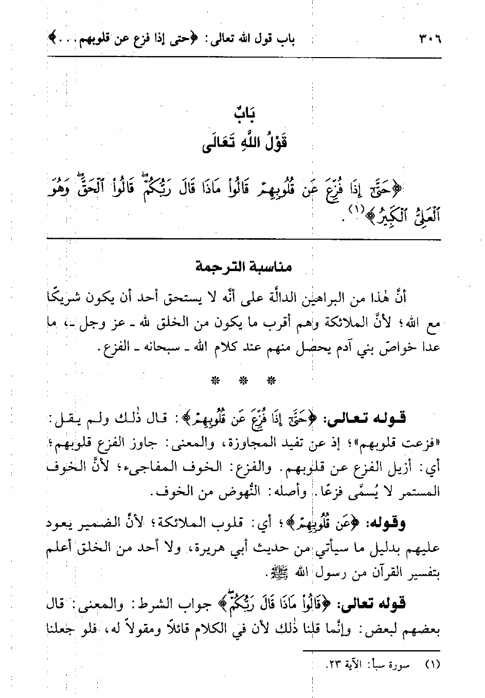 باب قول الله تعالى: {حَتَّى إِذَا فُزِّعَ عَنْ قُلُوبِهِمْ قَالُوا مَاذَا قَالَ رَبُّكُمْ قَالُوا الْحَقَّ وَهُوَ الْعَلِيُّ الْكَبِيرُ} 1.