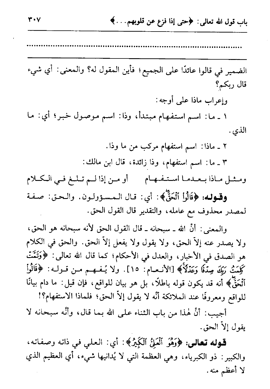 والمعنى: أن الله - سبحانه - قال القول الحق لأنه سبحانه هو الحق، ولا يصدر عنه إلا الحق ولا يقول ولا يفعل إلا الحق. والحق في الكلام هو الصدق في الأخبار، والعدل في الأحكام; كما قال الله تعالى: {وَتَمَّتْ كَلِمَتُ رَبِّكَ صِدْقاً وَعَدْلاً} 1. ولا يفهم من قوله: {قَالُوا الْحَقَّ} أنه قد يكون قوله باطلا، بل هو بيان للواقع، فإن قيل: ما دام بيانا للواقع ومعروفا عند الملائكة أنه لا يقول إلا الحق; فلماذا الاستفهام؟ !