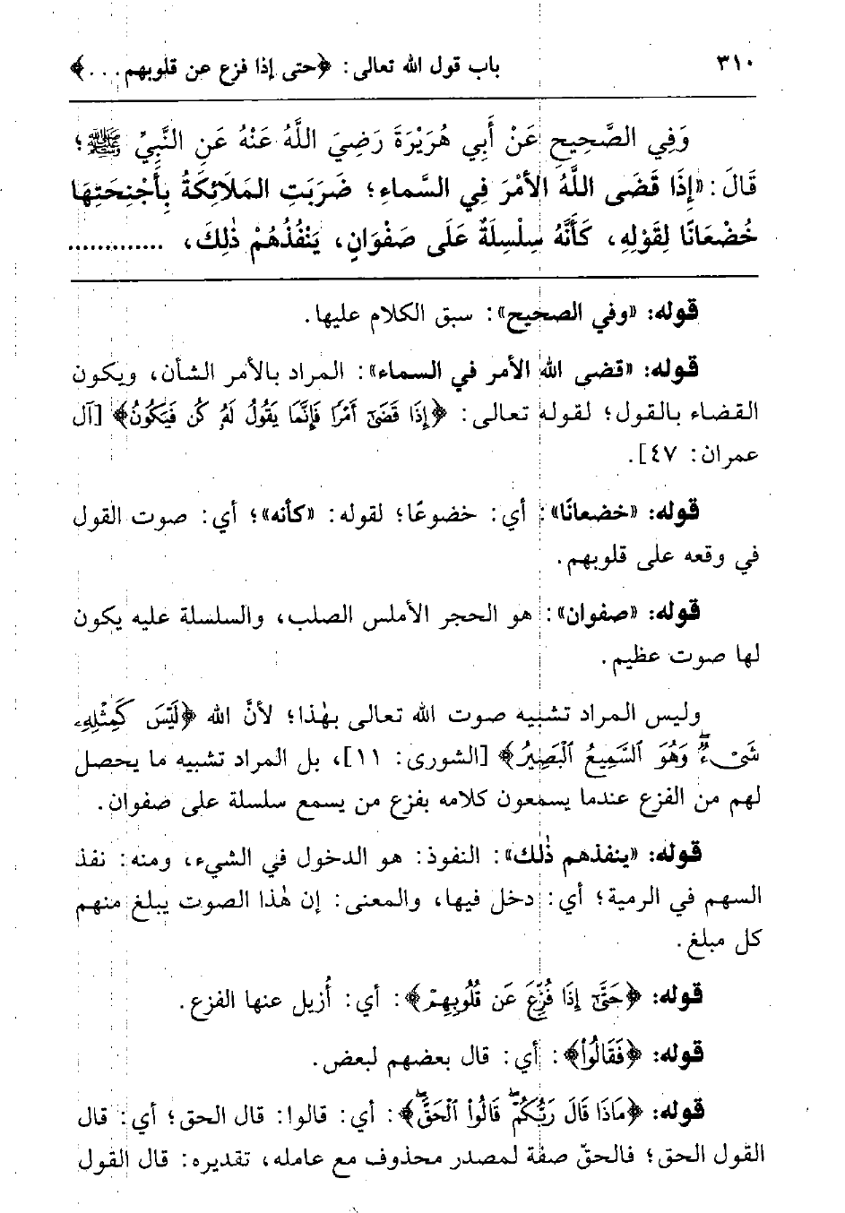 وليس المراد تشبيه صوت الله تعالى بهذا; لأن الله {لَيْسَ كَمِثْلِهِ شَيْءٌ وَهُوَ السَّمِيعُ الْبَصِيرُ} 3، بل المراد تشبيه ما يحصل لهم من الفزع عندما يسمعون كلامه بفزع من يسمع سلسلة على صفوان.