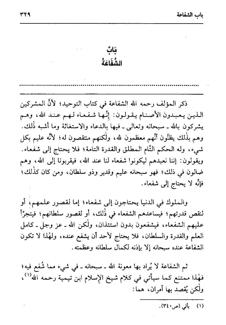 ذكر المؤلف رحمه الله الشفاعة في كتاب التوحيد; لأن المشركين الذين يعبدون الأصنام يقولون: إنها شفعاء لهم عند الله، وهم يشركون بالله - سبحانه وتعالى - فيها بالدعاء والاستغاثة وما أشبه ذلك. وهم بذلك يظنون أنهم معظمون لله، ولكنهم منتقصون له; لأنه عليم بكل شيء، وله الحكم التام المطلق والقدرة التامة; فلا يحتاج إلى شفعاء. ويقولون: إننا نعبدهم ليكونوا شفعاء لنا عند الله، فيقربونا إلى الله، وهم ضالون في ذلك; فهو سبحانه عليم وقدير وذو سلطان، ومن كان كذلك; فإنه لا يحتاج إلى شفعاء.