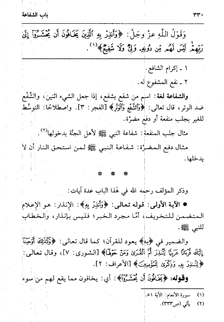 وقول الله عزوجل: {وَأَنْذِرْ بِهِ الَّذِينَ يَخَافُونَ أَنْ يُحْشَرُوا إِلَى رَبِّهِمْ لَيْسَ لَهُمْ مِنْ دُونِهِ وَلِيٌّ وَلا شَفِيعٌ} 1.