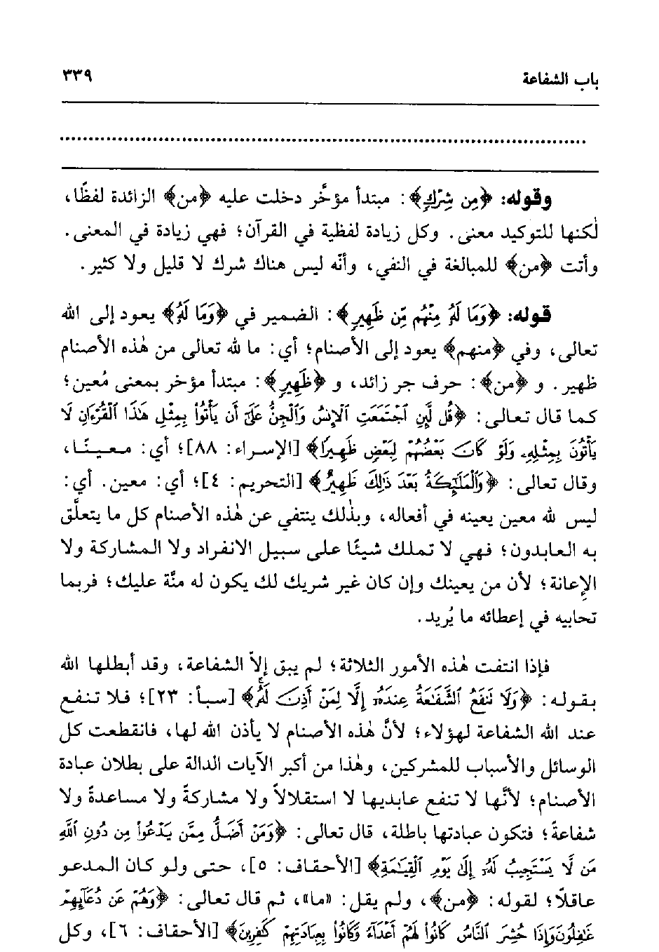 فإذا انتفت هذه الأمور الثلاثة; لم يبق إلا الشفاعة، وقد أبطلها الله بقوله: {وَلا تَنْفَعُ الشَّفَاعَةُ عِنْدَهُ إِلَّا لِمَنْ أَذِنَ لَهُ} 4 ; فلا تنفع عند الله الشفاعة لهؤلاء; لأن هذه الأصنام لا يأذن الله لها، فانقطعت كل الوسائل والأسباب للمشركين، وهذا من أكبر الآيات الدالة على بطلان عبادة الأصنام; لأنها لا تنفع عابديها لا استقلالا ولا مشاركة ولا مساعدة ولا شفاعة; فتكون عبادتها باطلة، قال تعالى: {وَمَنْ أَضَلُّ مِمَّنْ يَدْعُو مِنْ دُونِ اللَّهِ مَنْ لا يَسْتَجِيبُ لَهُ إِلَى يَوْمِ الْقِيَامَةِ} 5، حتى ولو كان المدعو عاقلا; لقوله: "من"، ولم يقل: "ما"، ثم قال تعالى: {وَهُمْ عَنْ دُعَائِهِمْ غَافِلُونَ وَإِذَا حُشِرَ النَّاسُ كَانُوا لَهُمْ أَعْدَاءً وَكَانُوا بِعِبَادَتِهِمْ كَافِرِينَ} 6، وكل