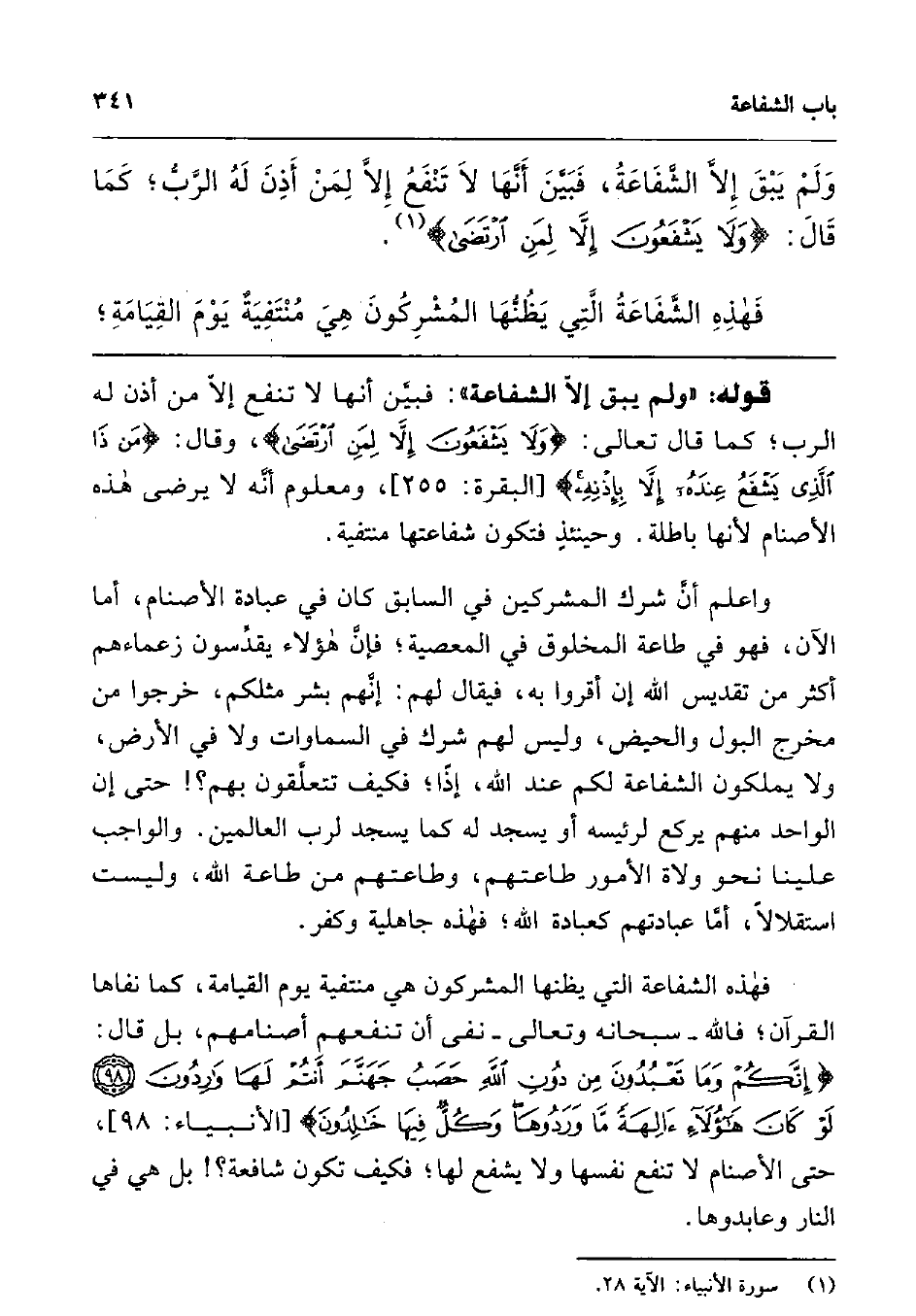 فهذه الشفاعة التي يظنها المشركون هي منتفية يوم القيامة، كما نفاها القرآن; فالله - سبحانه وتعالى - نفى أن تنفعهم أصنامهم، بل قال: {إِنَّكُمْ وَمَا تَعْبُدُونَ مِنْ دُونِ اللَّهِ حَصَبُ جَهَنَّمَ أَنْتُمْ لَهَا وَارِدُونَ لَوْ كَانَ هَؤُلاءِ آلِهَةً مَا وَرَدُوهَا وَكُلٌّ فِيهَا خَالِدُونَ} 4، حتى الأصنام لا تنفع نفسها ولا يشفع لها; فكيف تكون شافعة؟ ! بل هي في النار وعابدوها.