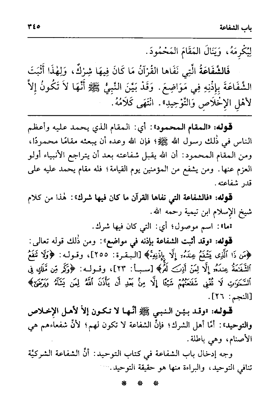 فالشفاعة التي نفاها القرآن ما كان فيها شرك، ولهذا أثبت الشفاعة بإذنه في مواضع وقد بين النبي صلى الله عليه وسلم أنها لا تكون إلا لأهل الإخلاص والتوحيد" انتهى كلامه.