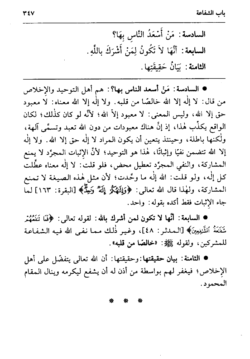 السابعة: أنها لا تكون لمن أشرك بالله: لقوله تعالى: {فَمَا تَنْفَعُهُمْ شَفَاعَةُ الشَّافِعِينَ} 2، وغير ذلك مما نفى الله فيه الشفاعة للمشركين، ولقوله صلى الله عليه وسلم " خالصا من قلبه "3.