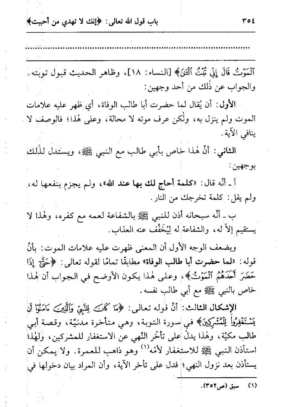 ب- أنه سبحانه أذن للنبي صلى الله عليه وسلم بالشفاعة لعمه مع كفره، وهذا لا يستقيم إلا له، والشفاعة له ليخفف عنه العذاب ويضعف الوجه الأول أن المعنى ظهرت عليه علامات الموت: بأن قوله: "لما حضرت أبا طالب الوفاة" مطابقا تماما لقوله تعالى: {حَتَّى إِذَا حَضَرَ أَحَدَهُمُ الْمَوْتُ} 2 وعلى هذا يكون الأوضح في الجواب أن هذا خاص بالنبي صلى الله عليه وسلم مع أبي طالب نفسه.