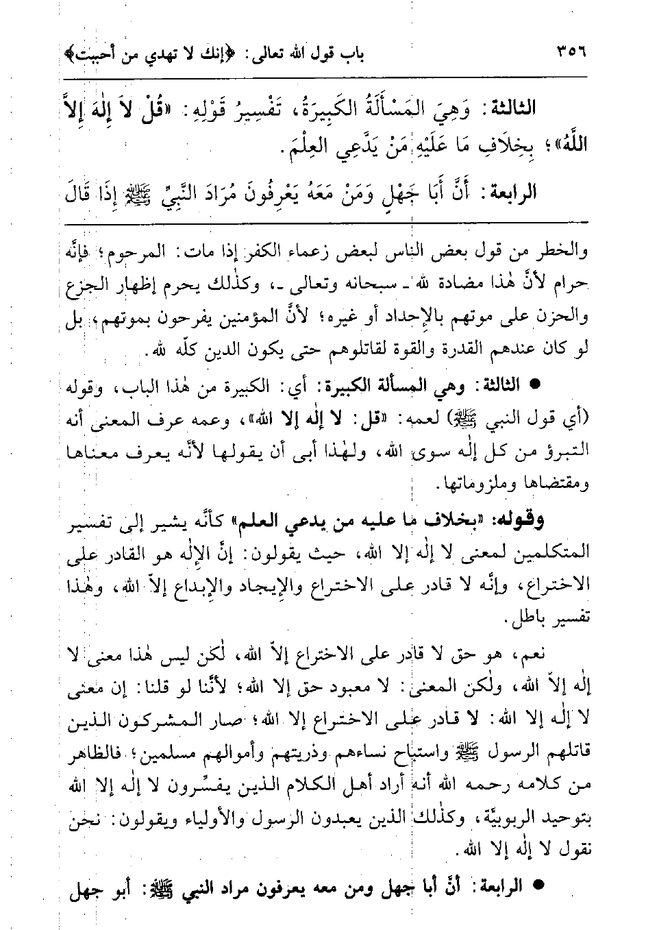 الثالثة: وهي المسألة الكبيرة: أي: الكبيرة من هذا الباب، وقوله (أي قول النبي صلى الله عليه وسلم) لعمه: " قل: لا إله إلا الله "1 وعمه عرف المعنى أنه التبرؤ من كل إله سوى الله ولهذا أبى أن يقولها لأنه يعرف معناها ومقتضاها وملزوماتها.