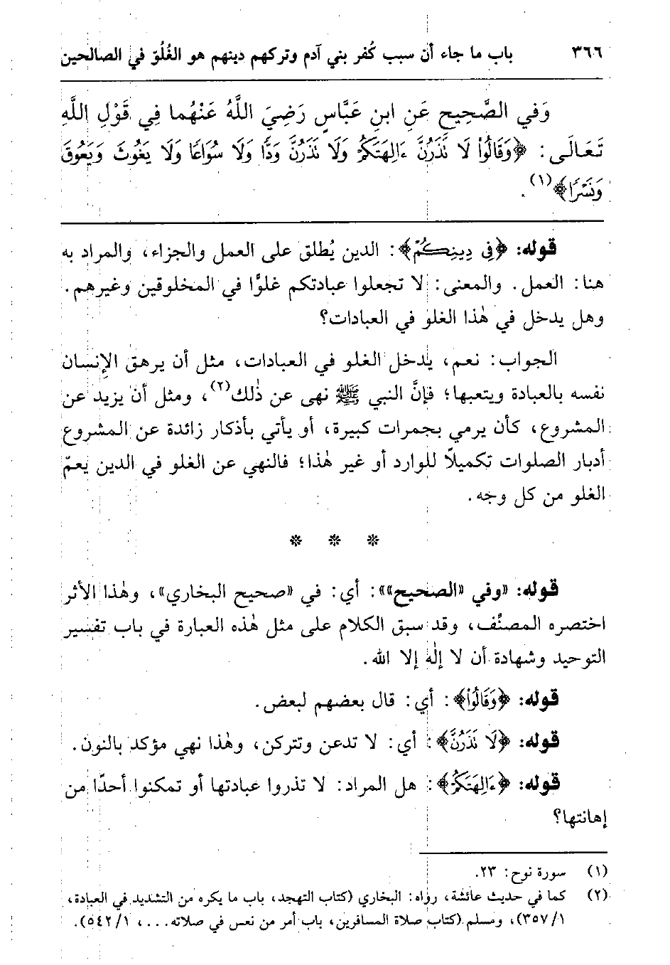 وفي الصحيح عن ابن عباس رضي الله عنهما في قول الله تعالى: لا تَغْلُوا فِي دِينِكُمْ) (النساء: من الآية171) : {وَقَالُوا لا تَذَرُنَّ آلِهَتَكُمْ وَلا تَذَرُنَّ وَدّاً وَلا سُوَاعاً وَلا يَغُوثَ وَيَعُوقَ وَنَسْراً} 1.