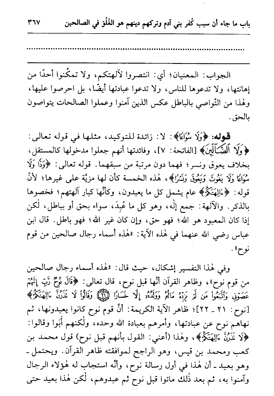 وفي هذا التفسير إشكال، حيث قال: هذه أسماء رجال صالحين من قوم نوح، وظاهر القرآن أنها قبل نوح، قال تعالى: {قَالَ نُوحٌ رَبِّ إِنَّهُمْ عَصَوْنِي وَاتَّبَعُوا مَنْ لَمْ يَزِدْهُ مَالُهُ وَوَلَدُهُ إِلاَّ خَسَاراً وَمَكَرُوا مَكْراً كُبَّاراً وَقَالُوا لا تَذَرُنَّ آلِهَتَكُمْ} 2; ظاهر الآية الكريمة: أن قوم نوح كانوا يعبدونها، ثم نهاهم نوح عن عبادتها، وأمرهم بعبادة الله وحده، ولكنهم أبوا وقالوا: {لا تَذَرُنَّ آلِهَتَكُمْ} وهذا (أعني: القول بأنهم قبل نوح) قول محمد بن كعب ومحمد بن قيس، وهو الراجح لموافقته ظاهر القرآن ويحتمل - وهو بعيد - أن هذا في أول رسالة نوح، وأنه استجاب له هؤلاء الرجال وآمنوا به، ثم بعد ذلك ماتوا قبل نوح ثم عبدوهم، لكن هذا بعيد حتى