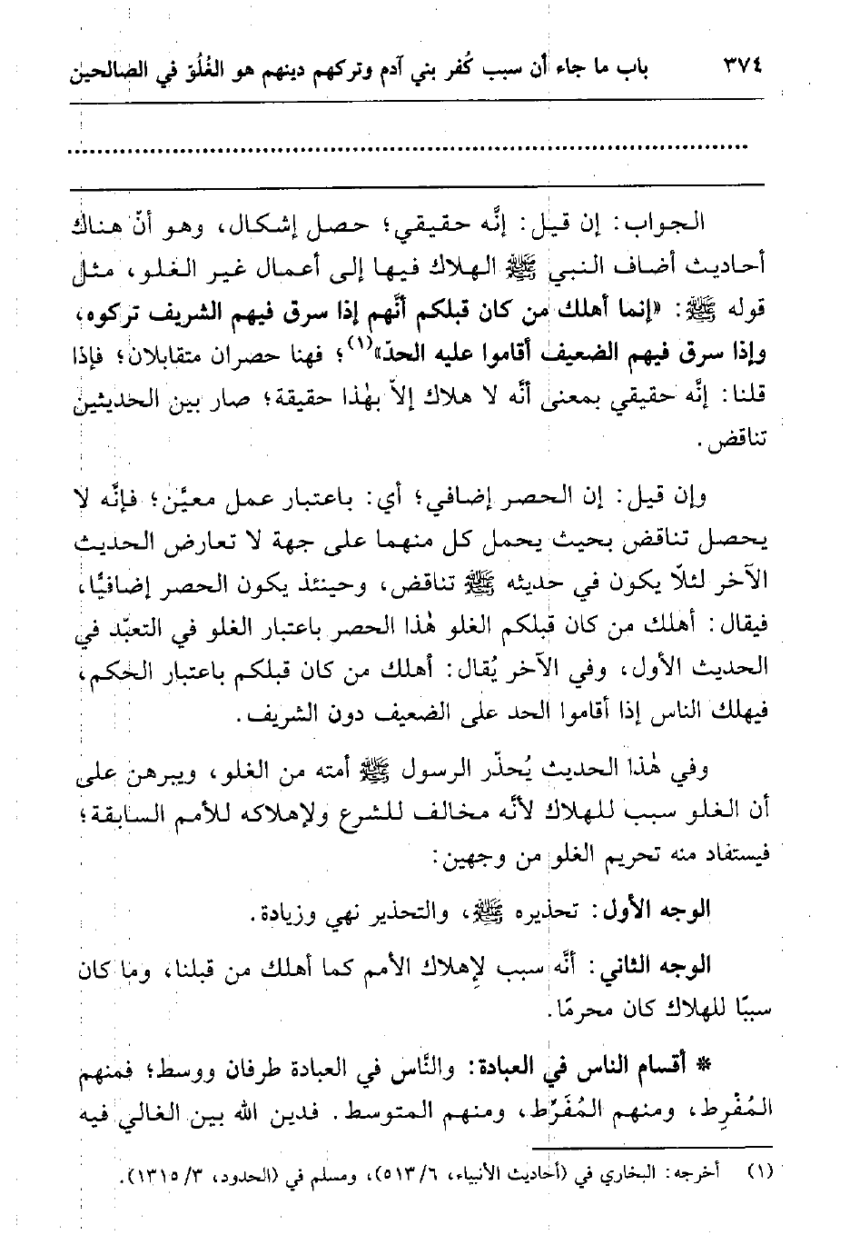 الجواب: إن قيل: إنه حقيقي; حصل إشكال، وهو أن هناك أحاديث أضاف النبي صلى الله عليه وسلم الهلاك فيها إلى أعمال غير الغلو، مثل قوله صلى الله عليه وسلم " إنما أهلك من كان قبلكم أنهم إذا سرق فيهم الشريف تركوه، وإذا سرق فيهم الضعيف أقاموا عليه الحد "1 فهنا حصران متقابلان; فإذا قلنا: إنه حقيقي بمعنى أنه لا هلاك إلا بهذا حقيقة; صار بين الحديثين تناقض.