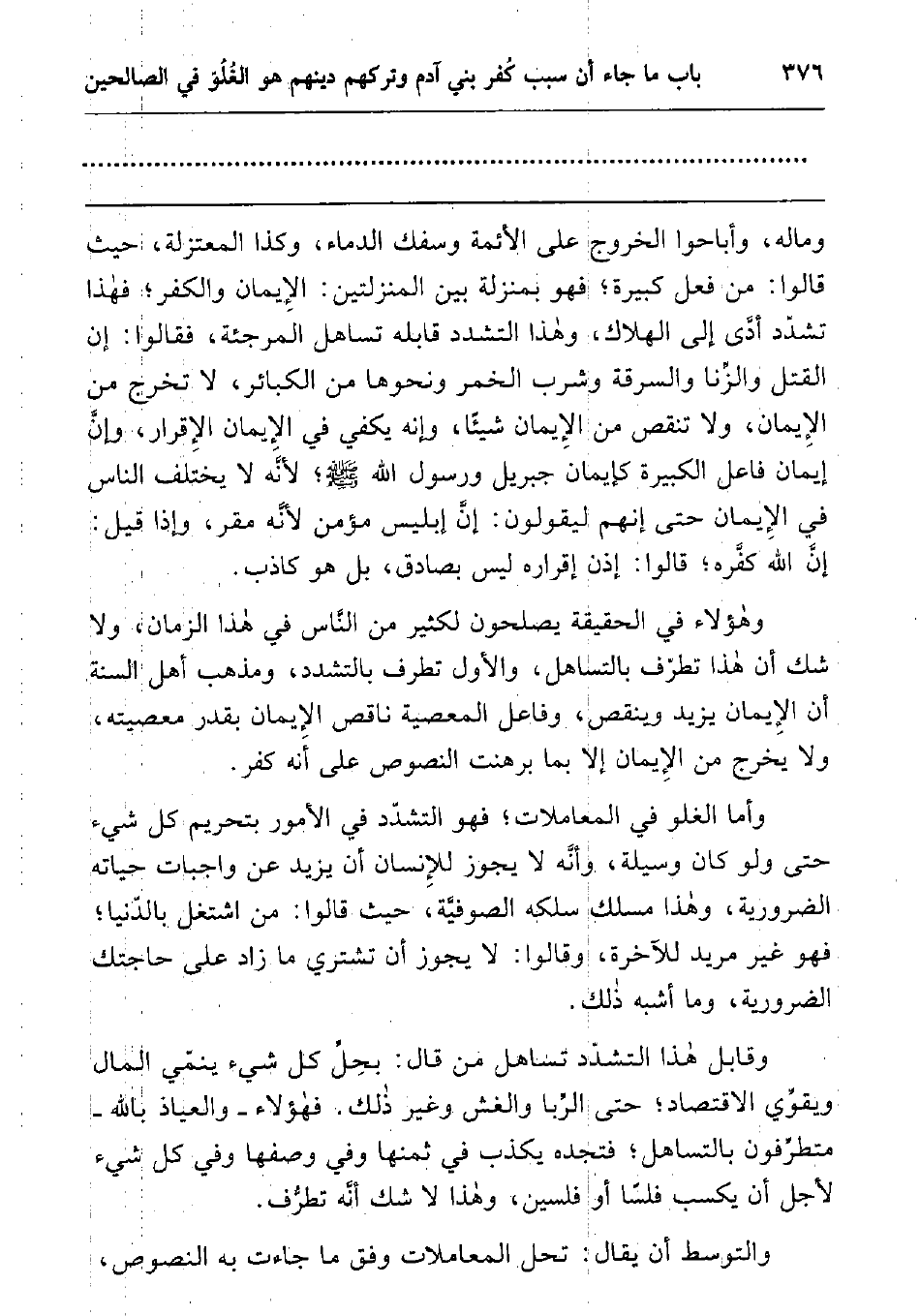 وماله، وأباحوا الخروج على الأئمة وسفك الدماء، وكذا المعتزلة، حيث قالوا: من فعل كبيرة; فهو بمنزلة بين المنزلتين: الإيمان والكفر; فهذا تشدد أدى إلى الهلاك، وهذا التشدد قابله تساهل المرجئة، فقالوا: إن القتل والزنا والسرقة وشرب الخمر ونحوها من الكبائر، لا تخرج من الإيمان، ولا تنقص من الإيمان شيئا، وإنه يكفي في الإيمان الإقرار، وإن إيمان فاعل الكبيرة كإيمان جبريل ورسول الله صلى الله عليه وسلم لأنه لا يختلف الناس في الإيمان حتى إنهم ليقولون: إن إبليس مؤمن لأنه مقر، وإذا قيل: إن الله كفره; قالوا: إذن إقراره ليس بصادق، بل هو كاذب وهؤلاء في الحقيقة يصلحون لكثير من الناس في هذا الزمان، ولا شك أن هذا تطرف بالتساهل، والأول تطرف بالتشدد، ومذهب أهل السنة أن الإيمان يزيد وينقص، وفاعل المعصية ناقص الإيمان بقدر معصيته، ولا يخرج من الإيمان إلا بما برهنت النصوص على أنه كفر.
