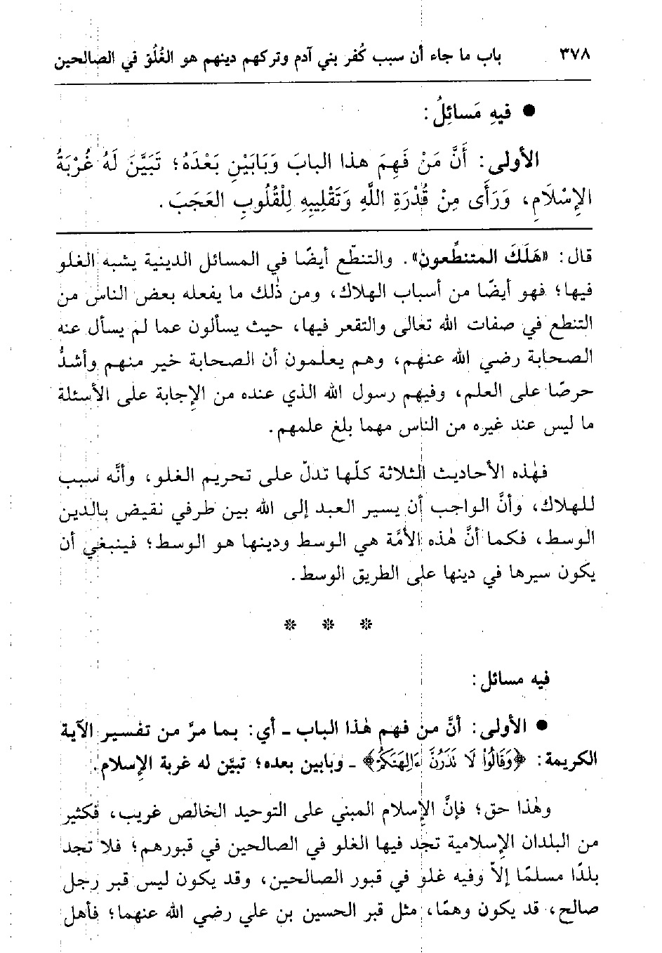 الأولى: أن من فهم هذا الباب - أي: بما مر من تفسير الآية الكريمة: {وَقَالُوا لا تَذَرُنَّ آلِهَتَكُمْ} 1 - وبابين بعده; تبين له غربة الإسلام وهذا حق; فإن الإسلام المبني على التوحيد الخالص غريب، فكثير من البلدان الإسلامية تجد فيها الغلو في الصالحين في قبورهم فلا تجد بلدا مسلما إلا وفيه غلو في قبور الصالحين، وقد يكون ليس قبر رجل صالح، قد يكون وهما، مثل قبر الحسين بن علي رضي الله عنهما; فأهل