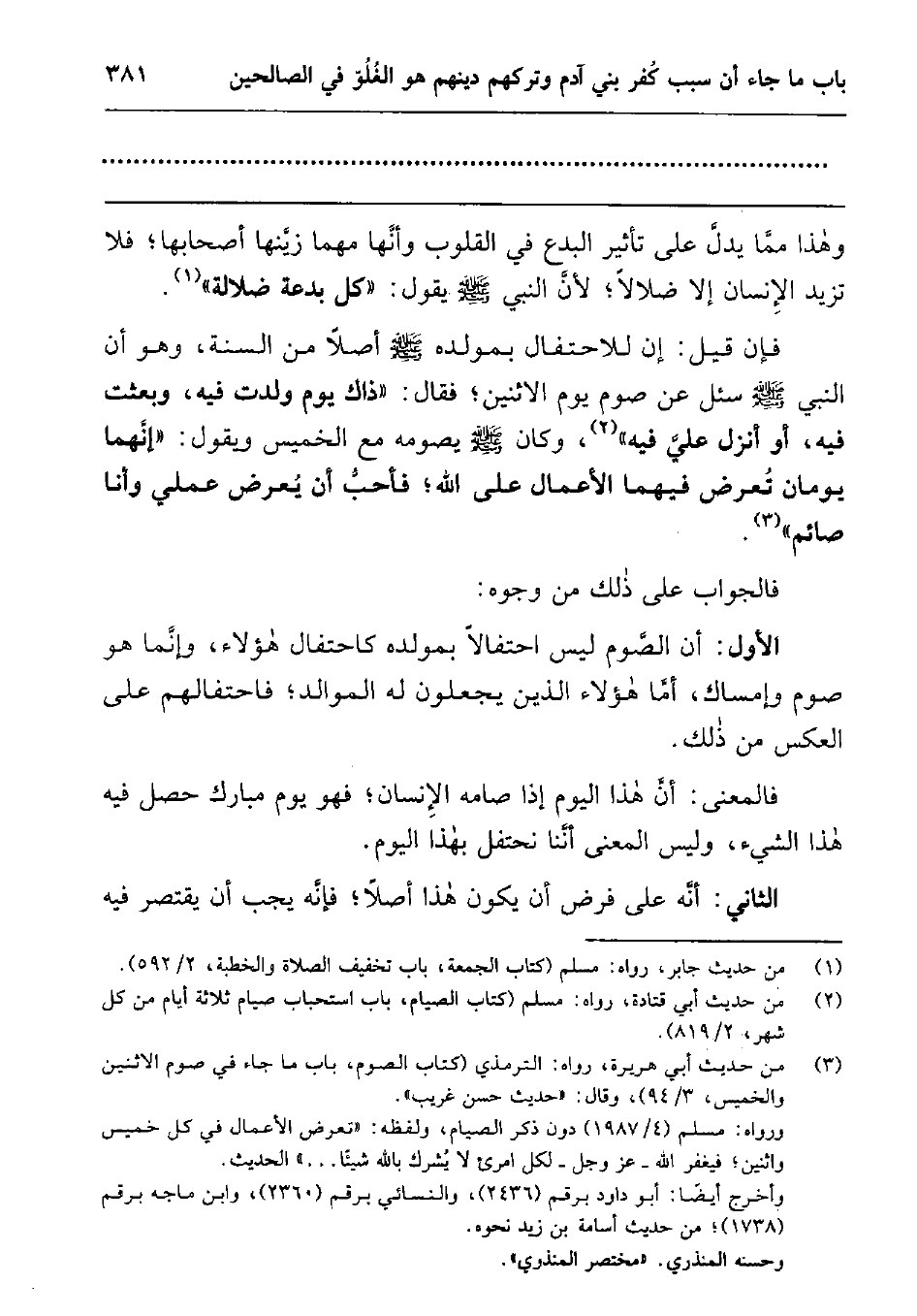 وهذا مما يدل على تأثير البدع في القلوب وأنها مهما زينها أصحابها; فلا تزيد الإنسان إلا ضلالا; لأن النبي صلى الله عليه وسلم يقول: " كل بدعة ضلالة "1 فإن قيل: إن للاحتفال بمولده صلى الله عليه وسلم أصلا من السنة، وهو أن النبي صلى الله عليه وسلم سئل عن صوم يوم الاثنين; فقال: " ذاك يوم ولدت فيه، وبعثت فيه، أو أنزل علي فيه "2 وكان صلى الله عليه وسلم يصومه مع الخميس ويقول: " إنهما يومان تعرض فيهما الأعمال على الله; فأحب أن يعرض عملي وأنا صائم "3 فالجواب على ذلك من وجوه: