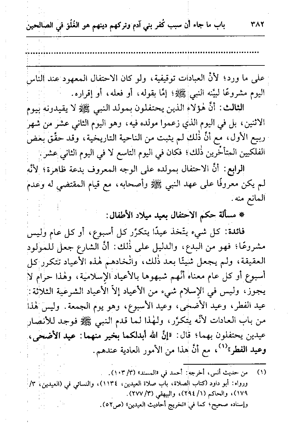 فائدة: كل شيء يتخذ عيدا يتكرر كل أسبوع، أو كل عام وليس مشروعا، فهو من البدع، والدليل على ذلك: أن الشارع جعل للمولود العقيقة، ولم يجعل شيئا بعد ذلك، واتخاذهم هذه الأعياد تتكرر كل أسبوع أو كل عام معناه أنهم شبهوها بالأعياد الإسلامية، وهذا حرام لا يجوز، وليس في الإسلام شيء من الأعياد إلا الأعياد الشرعية الثلاثة: عيد الفطر، وعيد الأضحى، وعيد الأسبوع، وهو يوم الجمعة. وليس هذا من باب العادات لأنه يتكرر، ولهذا لما قدم النبي صلى الله عليه وسلم فوجد للأنصار عيدين يحتفلون بهما; قال: " إن الله أبدلكما بخير منهما: عيد الأضحى، وعيد الفطر "1 مع أن هذا من الأمور العادية عندهم.