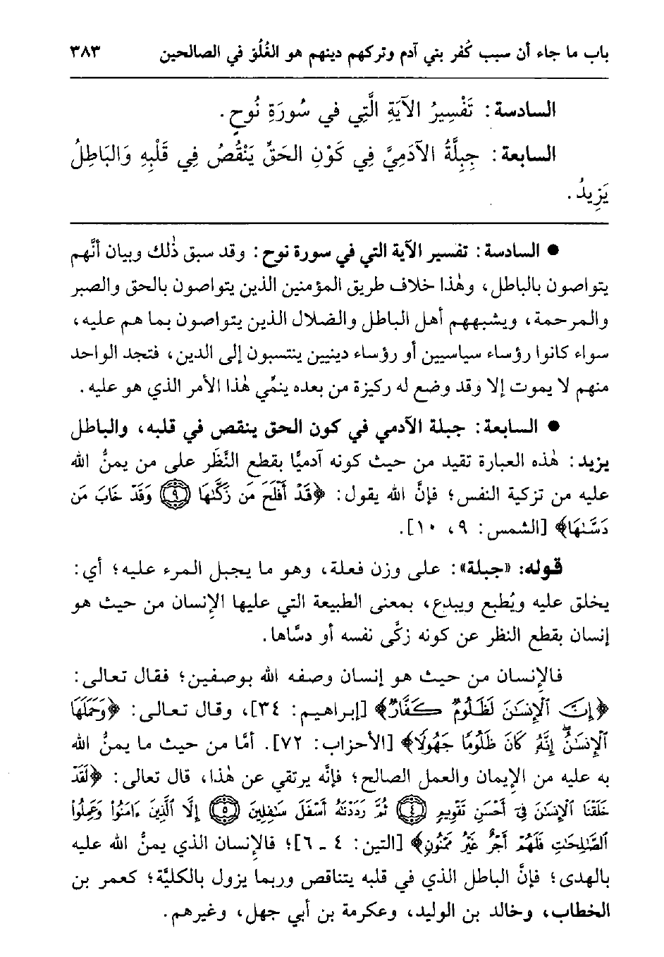 السابعة: جبلة الآدمي في كون الحق ينقص في قلبه، والباطل يزيد: هذه العبارة تقيد من حيث كونه آدميا بقطع النظر عمن يمن الله عليه بتزكيه النفس; فإن الله يقول: {قَدْ أَفْلَحَ مَنْ زَكَّاهَا وَقَدْ خَابَ مَنْ دَسَّاهَا} 1 قوله: "جبلة": على وزن فعلة، وهو ما يجبل المرء عليه; أي: يخلق عليه ويطبع ويبدع، بمعنى الطبيعة التي عليها الإنسان من حيث هو إنسان بقطع النظر عن كونه زكى نفسه أو دساها.