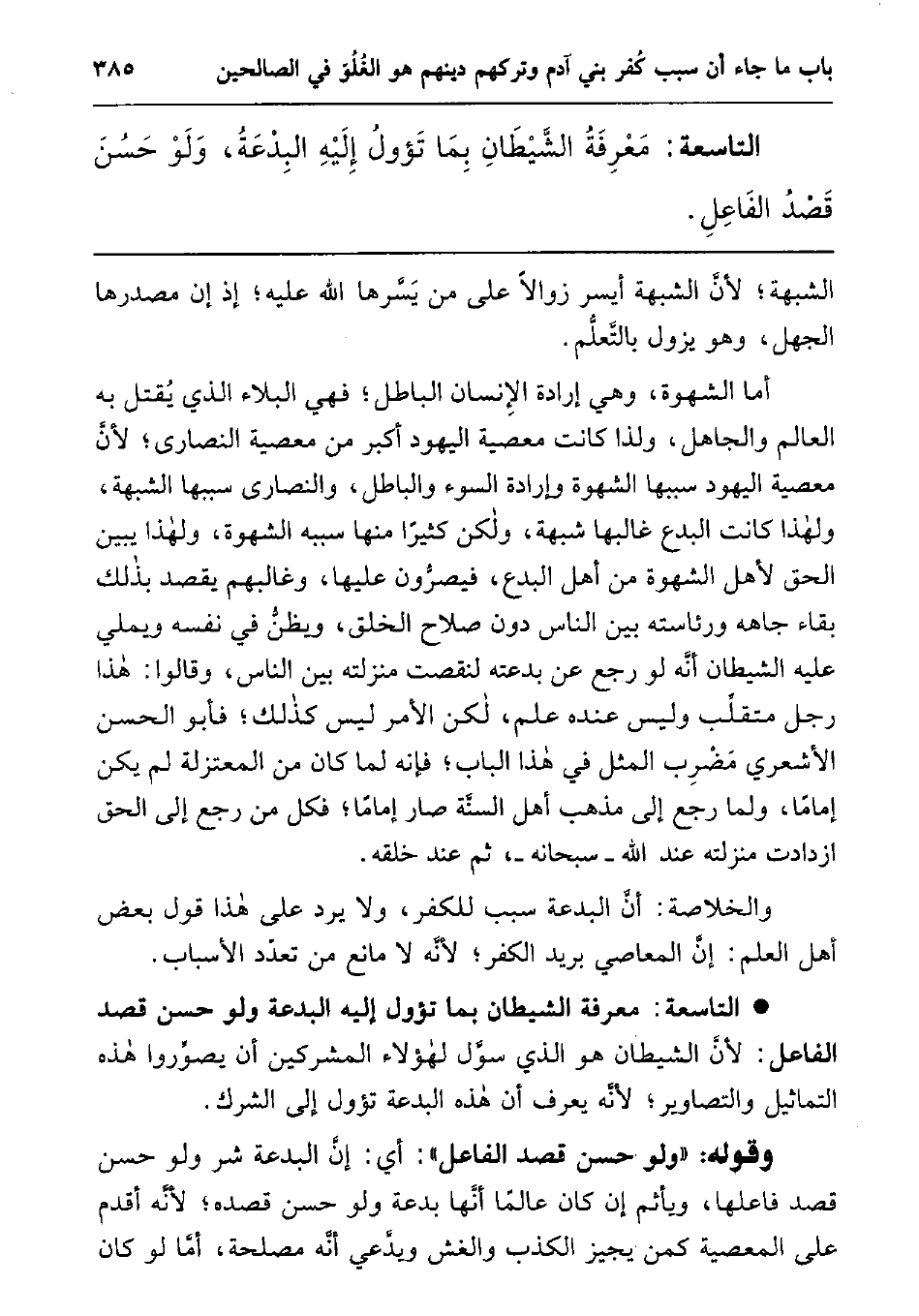 التاسعة: معرفة الشيطان بما تئول إليه البدعة، ولو حسن قصد الفاعل.