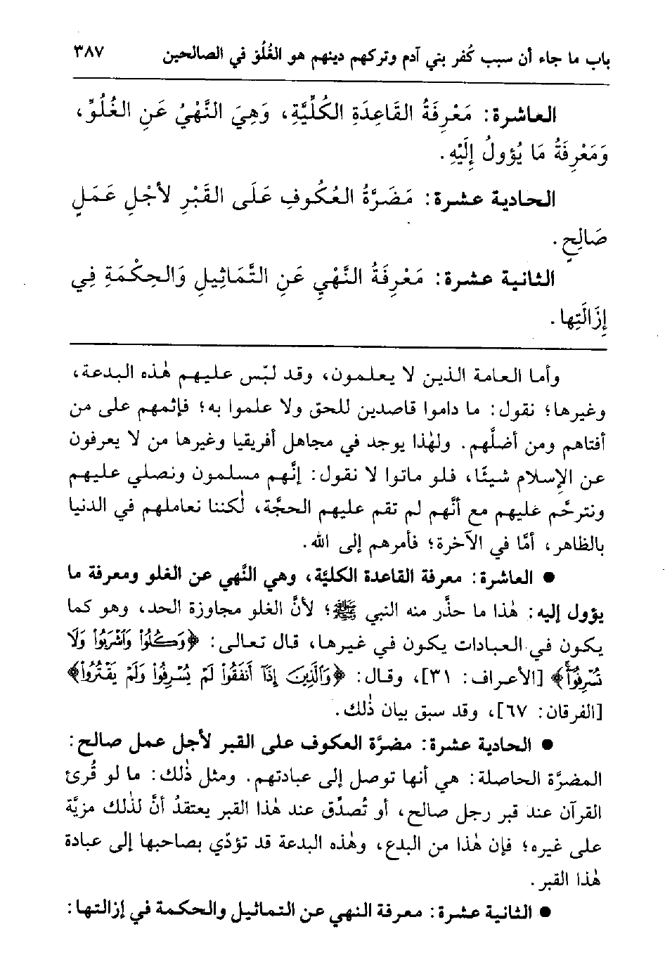 العاشرة: معرفة القاعدة الكلية، وهي النهي عن الغلو ومعرفة ما يئول إليه: هذا ما حذر منه النبي صلى الله عليه وسلم لأن الغلو مجاوزة الحد، وهو كما يكون في العبادات يكون في غيرها، قال تعالى: {وَكُلُوا وَاشْرَبُوا وَلا تُسْرِفُوا} 1، وقال: {وَالَّذِينَ إِذَا أَنْفَقُوا لَمْ يُسْرِفُوا وَلَمْ يَقْتُرُوا} 2، وقد سبق بيان ذلك.