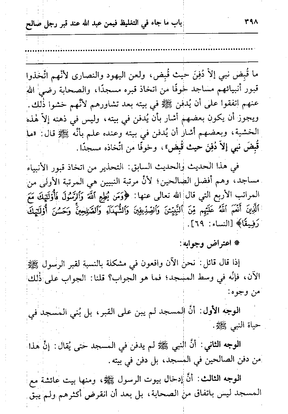 إذا قال قائل: نحن الآن واقعون في مشكلة بالنسبة لقبر الرسول صلى الله عليه وسلم الآن، فإنه في وسط المسجد; فما هو الجواب؟ قلنا: الجواب على ذلك من وجوه:
