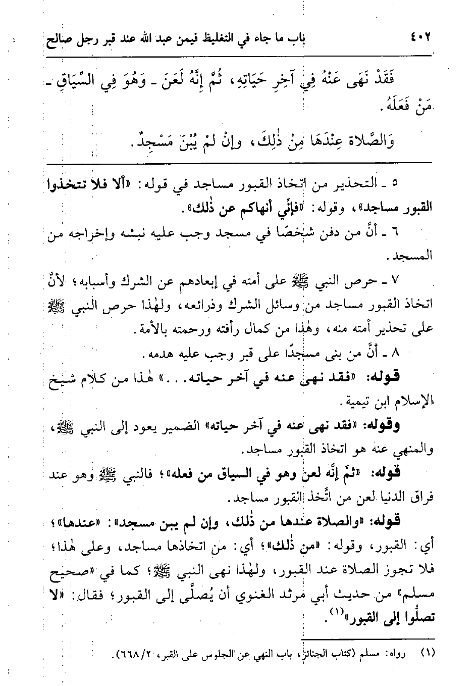 قوله: "فقد نهى عنه في آخر حياته ... " هذا من كلام شيخ الإسلام ابن تيمية. وقوله: "فقد نهى عنه في آخر حياته" الضمير يعود إلى النبي صلى الله عليه وسلم والمنهي عنه هو اتخاذ القبور مساجد. قوله: "ثم إنه لعن وهو في السياق من فعله"; فالنبي صلى الله عليه وسلم وهو عند فراق الدنيا لعن من اتخذ القبور مساجد. قوله: "والصلاة عندها من ذلك، وإن لم يبن مسجد": "عندها"; أي: القبور، وقوله: "من ذلك"; أي: من اتخاذها مساجد، وعلى هذا; فلا تجوز الصلاة عند القبور، ولهذا نهى النبي صلى الله عليه وسلم كما في "صحيح مسلم" من حديث أبي مرثد الغنوي أن يُصلَّى إلى القبور; فقال صلى الله عليه وسلم: " لا تصلُّوا إلى القبور "2.
