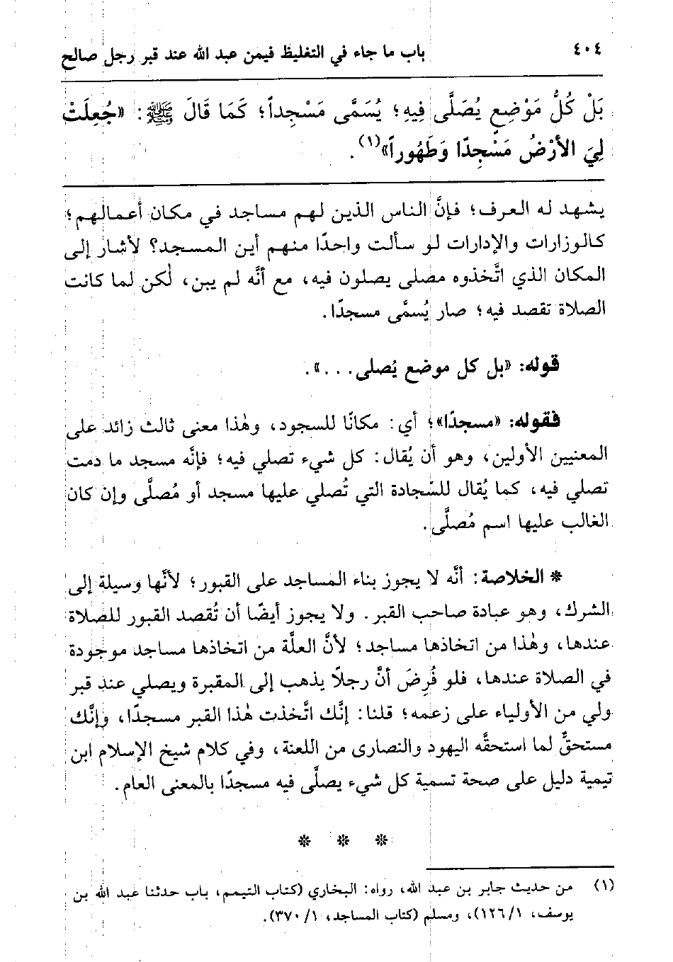 يشهد له العرف; فإن الناس الذين لهم مساجد في مكان أعمالهم; كالوزارات والإدارات لو سألت واحدا منهم أين المسجد؟ لأشار إلى المكان الذي اتخذوه مصلى يصلون فيه، مع أنه لم يبن، لكن لما كانت الصلاة تقصد فيه; صار يسمى مسجدا. قوله: "بل كل موضع يصلى ... ". فقوله: "مسجدا" ; أي: مكانا للسجود، وهذا معنى ثالث زائد على المعنيين الأولين، وهو أن يقال: كل شيء تصلي فيه، فإنه مسجد ما دمت تصلي فيه، كما يقال للسجادة التي تصلي عليها مسجد أو مصلى وإن كان الغالب عليها اسم مصلى. الخلاصة: أنه لا يجوز بناء المساجد على القبور; لأنها وسيلة إلى الشرك، وهو عبادة صاحب القبر. ولا يجوز أيضا أن تقصد القبور للصلاة عندها، وهذا من اتخاذها مساجد; لأن العلة من اتخاذها مساجد موجودة في الصلاة عندها، فلو فرض أن رجلا يذهب إلى المقبرة ويصلي عند قبر ولي من الأولياء على زعمه; قلنا: إنك اتخذت هذا القبر مسجدا، وإنك مستحق لما استحقه اليهود والنصارى من اللعنة، وفي كلام شيخ الإسلام ابن تيمية دليل على صحة تسمية كل شيء يصلى فيه مسجدا بالمعنى العام.