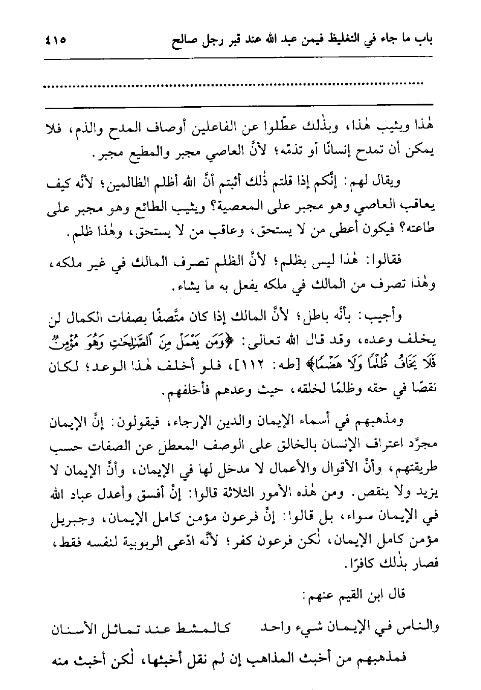 وأجيب: بأنه باطل; لأن المالك إذا كان متصفا بصفات الكمال لن يخلف وعده، وقد قال الله تعالى: {وَمَنْ يَعْمَلْ مِنَ الصَّالِحَاتِ وَهُوَ مُؤْمِنٌ فَلا يَخَافُ ظُلْماً وَلا هَضْماً} 1 [طه: 112] ، فلو أخلف هذا الوعد; لكان نقصا في حقه وظلما لخلقه، حيث وعدهم فأخلفهم.