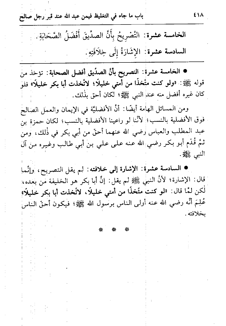 السادسة عشرة: الإشارة إلى خلافته: لم يقل التصريح، وإنما قال: الإشارة; لأن النبي صلى الله عليه وسلم لم يقل: إن أبا بكر هو الخليفة من بعده، لكن لما قال صلى الله عليه وسلم: " لو كنت متخذا من أمتي خليلا، لاتخذت أبا بكر خليلا "2 علم أنهرضي الله عنهأولى الناس برسول الله صلى الله عليه وسلم فيكون أحق الناس بخلافته.