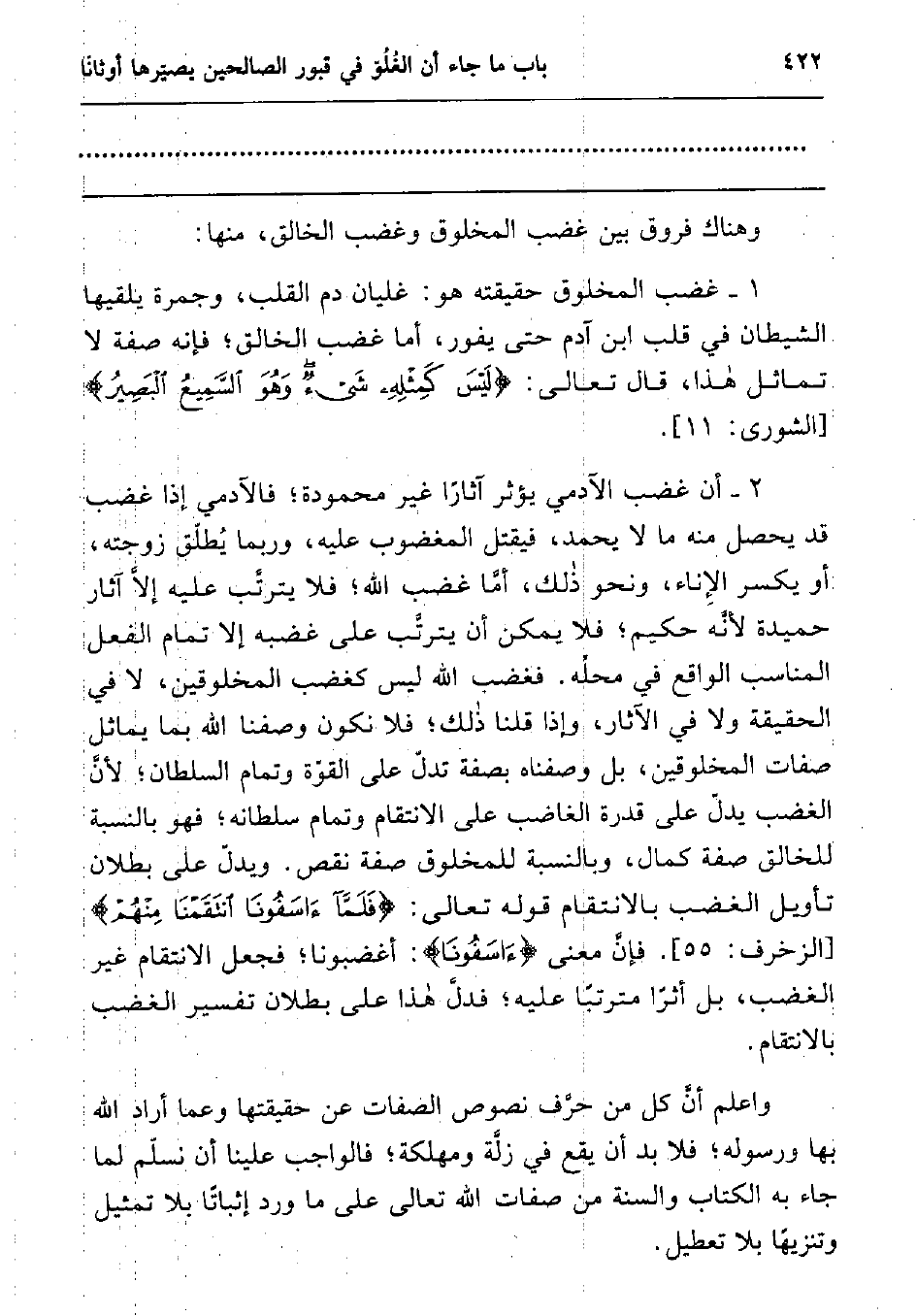 2. أن غضب الآدمي يؤثر آثارا غير محمودة; فالآدمي إذا غضب قد يحصل منه ما لا يحمد، فيقتل المغضوب عليه، وربما يطلق زوجته، أو يكسر الإناء، ونحو ذلك، أما غضب الله; فلا يترتب عليه إلا آثار حميدة لأنه حكيم; فلا يمكن أن يترتب على غضبه إلا تمام الفعل المناسب الواقع في محله. فغضب الله ليس كغضب المخلوقين، لا في الحقيقة ولا في الآثار، وإذا قلنا ذلك; فلا نكون وصفنا الله بما يماثل صفات المخلوقين، بل وصفناه بصفة تدل على القوة وتمام السلطان; لأن الغضب يدل على قدرة الغاضب على الانتقام وتمام سلطانه; فهو بالنسبة للخالق صفة كمال، وبالنسبة للمخلوق صفة نقص. ويدل على بطلان تأويل الغضب بالانتقام قوله تعالى: {فَلَمَّا آسَفُونَا انْتَقَمْنَا مِنْهُمْ فَأَغْرَقْنَاهُمْ أَجْمَعِينَ} 2 فإن معنى "آسفونا": أغضبونا; فجعل الانتقام غير الغضب، بل أثرا مترتبا عليه; فدل هذا على بطلان تفسير الغضب بالانتقام.