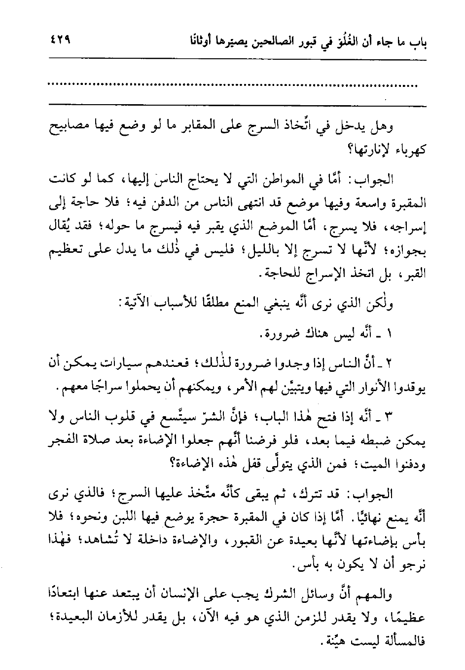 3. أنه إذا فتح هذا الباب; فإن الشر سيتسع في قلوب الناس ولا يمكن ضبطه فيما بعد، فلو فرضنا أنهم جعلوا الإضاءة بعد صلاة الفجر ودفنوا الميت; فمن الذي يتولى قفل هذه الإضاءة؟ الجواب: قد تترك، ثم يبقى كأنه متخذ عليها السرج; فالذي نرى أنه يمنع نهائيا. أما إذا كان في المقبرة حجرة يوضع فيها اللبن ونحوه; فلا بأس بإضاءتها لأنها بعيدة عن القبور، والإضاءة داخلة لا تشاهد; فهذا نرجو أن لا يكون به بأس.