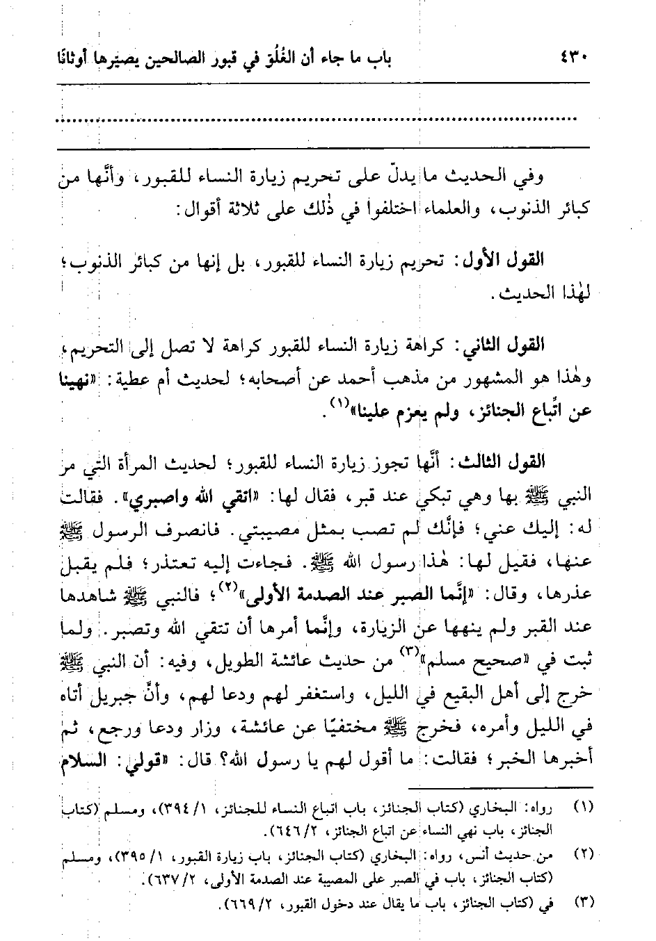 القول الأول: تحريم زيارة النساء للقبور، بل إنها من كبائر الذنوب; لهذا الحديث.