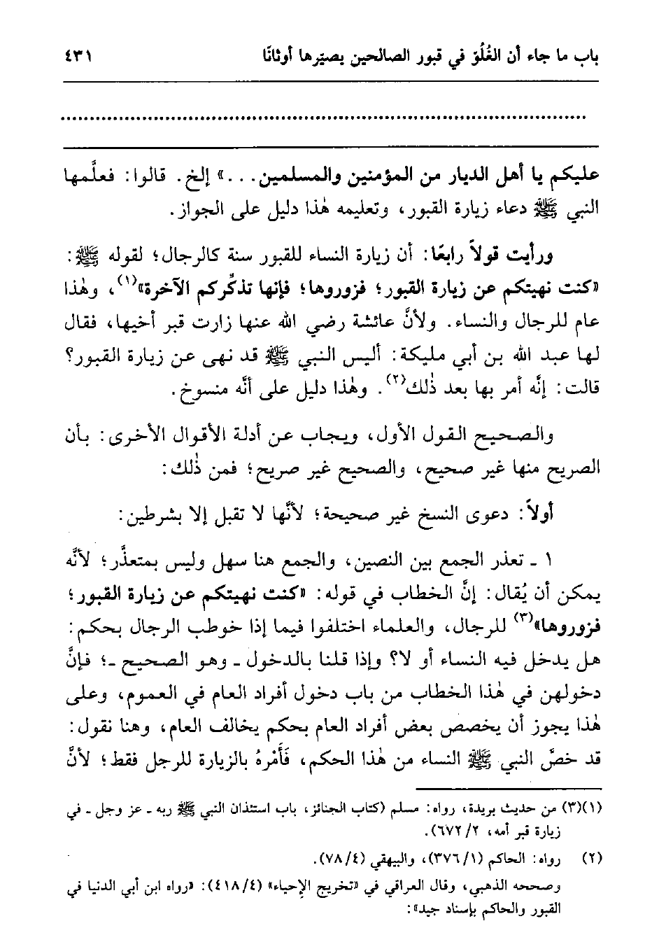 1. تعذر الجمع بين النصين، والجمع هنا سهل وليس بمتعذر; لأنه يمكن أن يقال: إن الخطاب في قوله: " كنت نهيتكم عن زيارة القبور; فزوروها " للرجال، والعلماء اختلفوا فيما إذا خوطب الرجال بحكم: هل يدخل فيه النساء أو لا؟ وإذا قلنا بالدخول - وهو الصحيح -; فإن دخولهن في هذا الخطاب من باب دخول أفراد العام في العموم، وعلى هذا يجوز أن يخصص بعض أفراد العام بحكم يخالف العام، وهنا نقول: قد خص النبي صلى الله عليه وسلم النساء من هذا الحكم، فأمره بالزيارة للرجل فقط; لأن